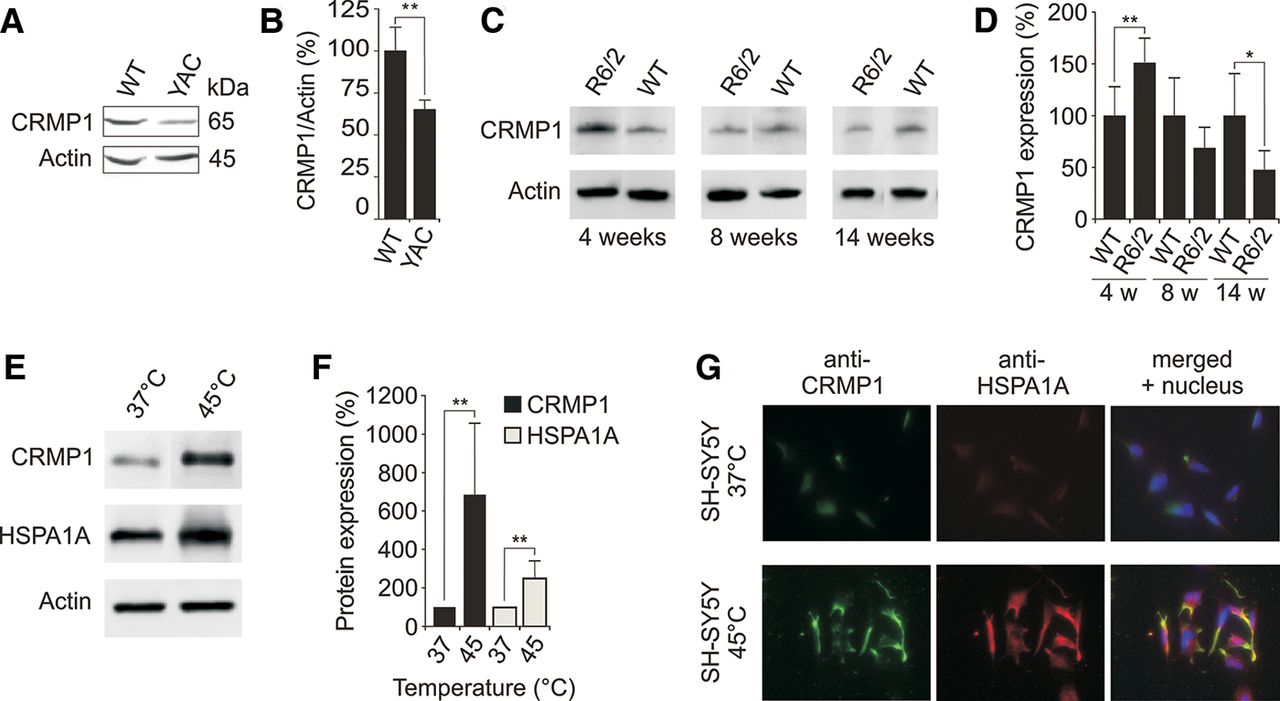 Expression of CRMP1 in brains of HD transgenic mice and cell models. (A) Endogenous CRMP1 protein levels are reduced in brain tissues of 12-mo-old YAC128 HD transgenic mice compared to controls. Protein extracts prepared from striatal tissues of wild-type and transgenic HD mice were analyzed by SDS-PAGE and immunoblotting using the anti-CRMP1 antibody 504-518. (B) Quantification of ∼65 kDa CRMP1 bands in A. Values represent the means of three independent experiments. (**) P ≤ 0.01, two-sided t-test with unequal variance. (C) Endogenous CRMP1 levels are altered in brains of R6/2 HD transgenic mice compared to controls. Protein extracts were analyzed by SDS-PAGE and immunoblotting using the anti-CRMP1 antibody 504-518. (D) Quantification of CRMP1 protein bands shown in C. Values represent the means of three independent experiments. (*) P < 0.1; (**) P ≤ 0.01, two-sided t-test with unequal variance. (E) Heat stress induces endogenous CRMP1 protein levels in SH-SY5Y neuroblastoma cells. Cell lysates were analyzed by SDS-PAGE and immunoblotting. (F) Quantification of CRMP1 and HSPA1A protein bands shown in E. Values represent the means of three independent experiments. (**) P ≤ 0.01, two-sided t-test with unequal variance. (G) Analysis of CRMP1 and HSPA1A protein expression in SH-SY5Y cells under heat stress conditions by immunofluorescence microscopy. Data in B, D, and F are represented as mean ± SEM.