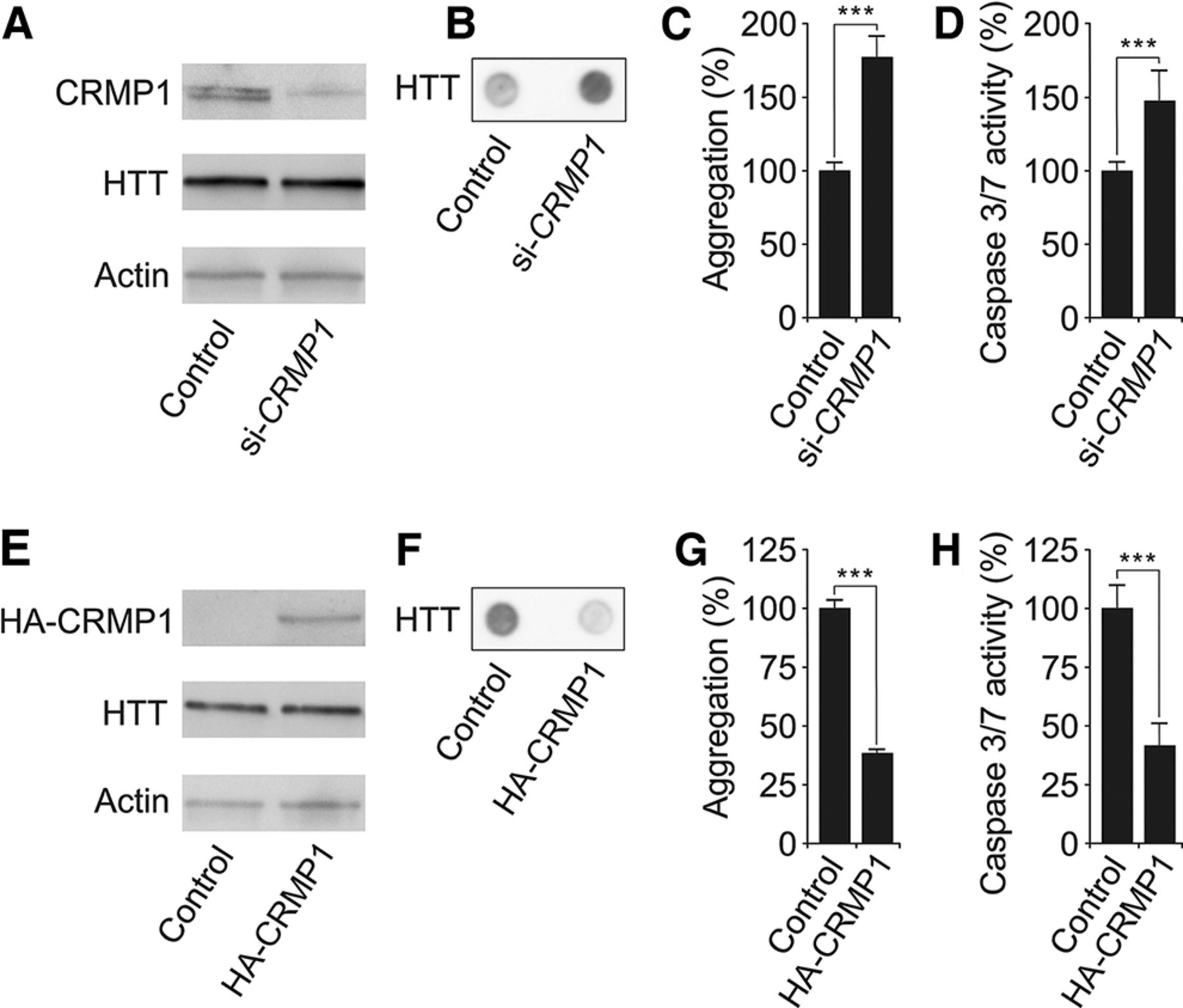 CRMP1 protein production influences polyQ-mediated HTT aggregation and toxicity in PC12 cells. (A,E) SDS-PAGE and immunoblot analysis of PC12 cells overproducing HTTQ103-EGFP fusion protein. Cells treated with si-CRMP1 RNA (A) or overproducing a HA-tagged CRMP1 protein (E) were analyzed. (B,F) Detection of insoluble HTTQ103-EGFP aggregates in si-CRMP1-treated (B) and HA-CRMP1 overproducing (F) PC12 cells. Insoluble aggregates (black dots) were detected by filter retardation assay. (C,G) Quantification of insoluble HTTQ103-EGFP aggregates shown in B and F by image analysis: n = 3; (***) P ≤ 0.001, two-sided t-test. (D,H) Quantification of caspase-3/7 activity in si-CRMP1-treated (D) and HA-CRMP1 overproducing (H) PC12-HTTQ103-EGFP cells: n = 3; (***) P ≤ 0.001, two-sided t-test. Data in C, D, G, and H are represented as mean ± SEM.