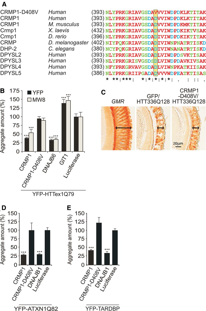 A mutant variant of CRMP1 (D408V) shows impaired activity in cell-based assays and HD transgenic flies. (A) Multiple sequence alignment of CRMP1 protein sequences. The aspartic acid residue 408 in human CRMP1 is conserved in a large number of related proteins (yellow box). (B) Effects of mCherry-tagged CRMP1 and CRMP1-D408V fusion proteins on aggregation of YFP-tagged HTTex1Q79 in cell-based assays. Formation of insoluble YFP-HTTex1Q79 aggregates in SH-EP cells was quantified by high-content fluorescence imaging. Aggregates were detected by YFP fluorescence of HTT aggregates or by immunostaining using the anti-HTT antibody MW8. MW8 preferentially detects insoluble HTT aggregates. Data are represented as mean ± SEM. (***) P ≤ 0.001, two-sided t-test with unequal variance. (C) Retinal degeneration in control flies carrying the GMR-GAL4 driver (GMR) alone and in flies coexpressing HTT336Q128 with CRMP1-D408V or the GFP control protein under control of the GMR driver. Analysis of eye sections reveals that in contrast to wild-type CRMP1, neither GFP nor CRMP1-D408V affects HTT336Q128-induced retinal degeneration compared to the GMR flies. (D–E) Effects of mCherry-tagged CRMP1 or CRMP1-D408V on aggregation of YFP-tagged ATXN1Q82 (D) or TARDBP (E) in cell-based assays. (D) YFP-ATXN1Q82 or (E) YFP-TARDBP aggregates were detected in SH-EP cells by YFP fluorescence and quantified by high-content fluorescence imaging. Data are represented as mean ± SEM. (***) P ≤ 0.001, two-sided t-test with unequal variance.
