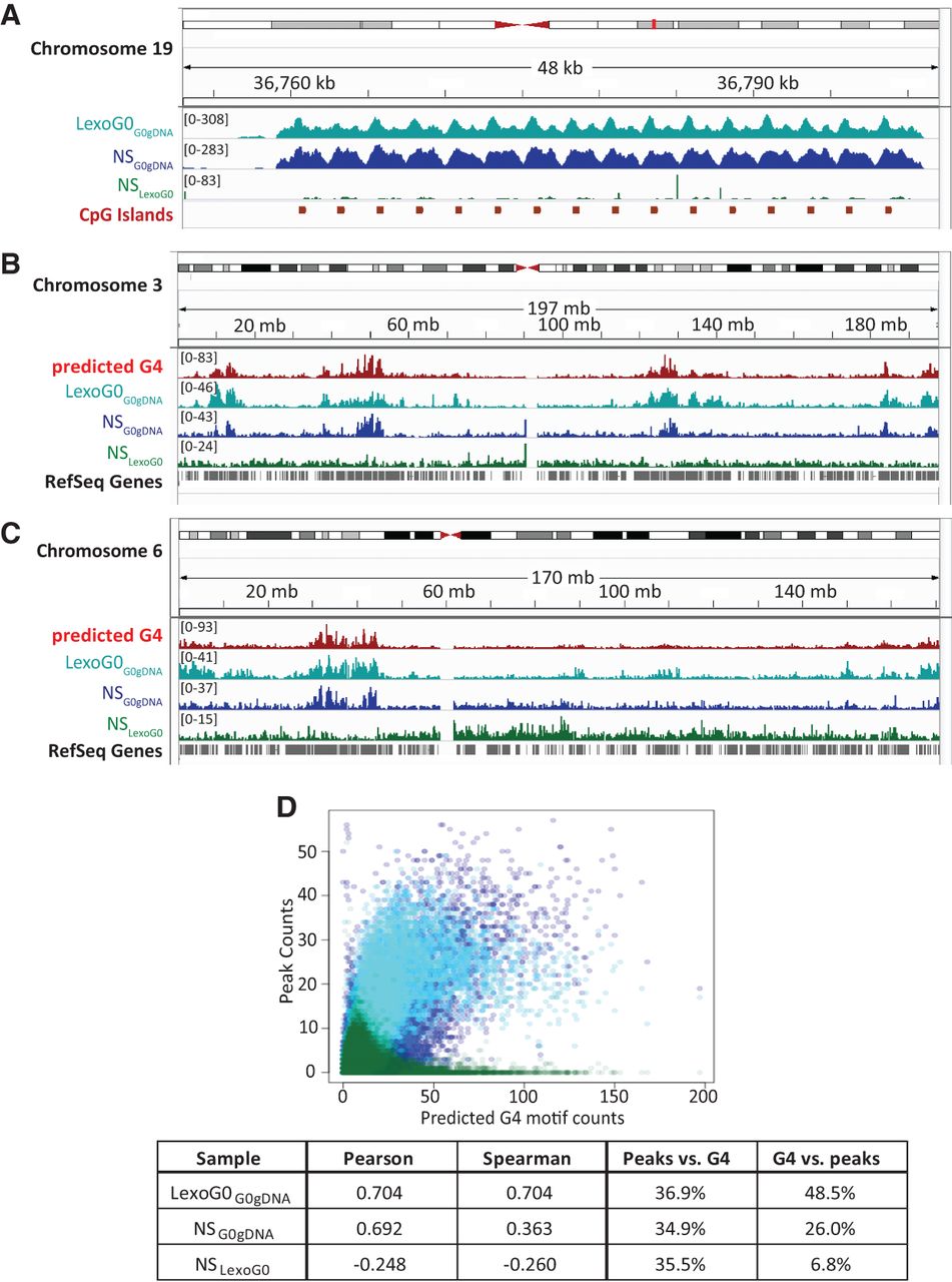 Correlation with predicted G4 motifs and CpG islands. (A) The −log10 (P-value) signal for LexoG0G0gDNA, NSG0gDNA, and NSLexoG0 for a 48-kb region on the q arm of Chromosome 19 containing a repeated array of CpG islands. (B,C) Density of G4 motifs and LexoG0G0gDNA, NSG0gDNA, and NSLexoG0 peaks on Chromosome 3 (B) and Chromosome 6 (C). (D) Scatterplot of genome-wide densities (counts in 100-kb bins) of LexoG0G0gDNA, NSG0gDNA, and NSLexoG0 peaks and predicted G4 motifs. Pearson's r and Spearman's ρ for the densities of the indicated sample and G4 motifs are displayed in the box, along with the percentage of overlap of peaks with predicted G4 motifs (peaks vs. G4) or vice versa (G4 vs. peaks) for each data set. For all panels, cyan, LexoG0G0gDNA; blue, NSG0gDNA; and green, NSLexoG0.