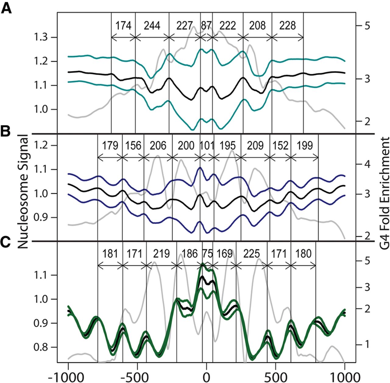 Distribution of nucleosomes around peak summits. In each panel, the nucleosome signal was plotted around the peak summits for (A) LexoG0G0gDNA, (B) NSG0gDNA, and (C) NSLexoG0. The colored lines show the nucleosome signal for K562 and GM12878 cells (Kundaje et al. 2012). The black line is the mean of the two cell lines. The vertical lines indicate the crest positions of the wave-like nucleosome signal, and the labeled arrows indicate the intercrest distances. The gray lines show the distribution of non-strand-oriented G4 motifs (log-transformed versions of Fig. 4A,C,E, respectively).