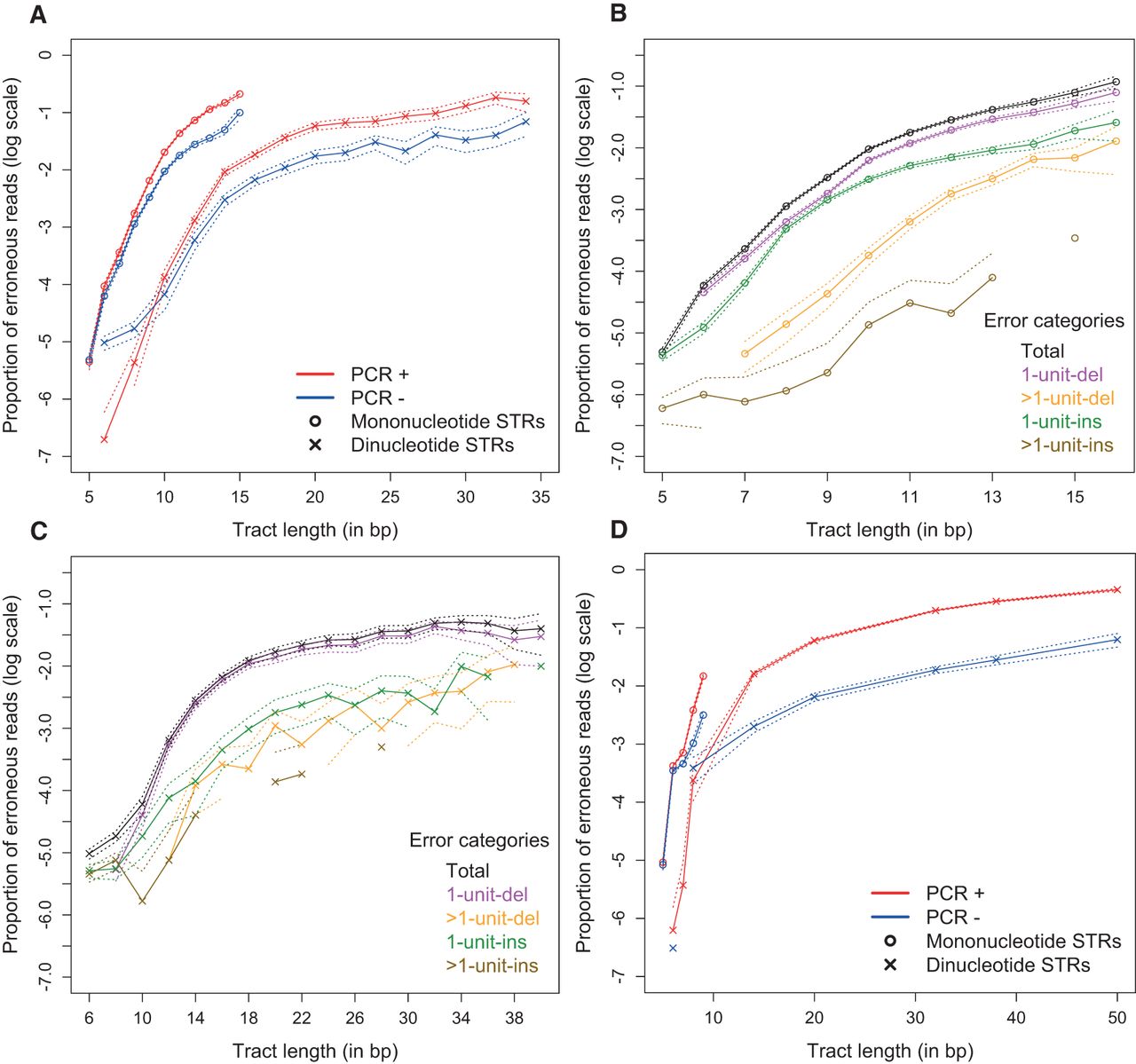 Erroneous call rates for Illumina data. The dotted lines represent the 95% confidence intervals of the multinomial sampling. Only repeat lengths with ≥100 read support (all loci combined) were plotted. (A) Human male X Chromosome for PCR-containing (PCR+) and PCR-free (PCR−; down-sampled data) library preparation protocols. (B) PCR− mononucleotide STR error rates by error categories. See text for the explanation of the categories. (C) PCR− dinucleotide STR error rates by error categories. (D) Error rates for ultradeep sequencing of plasmids with PCR+ and PCR− protocols.