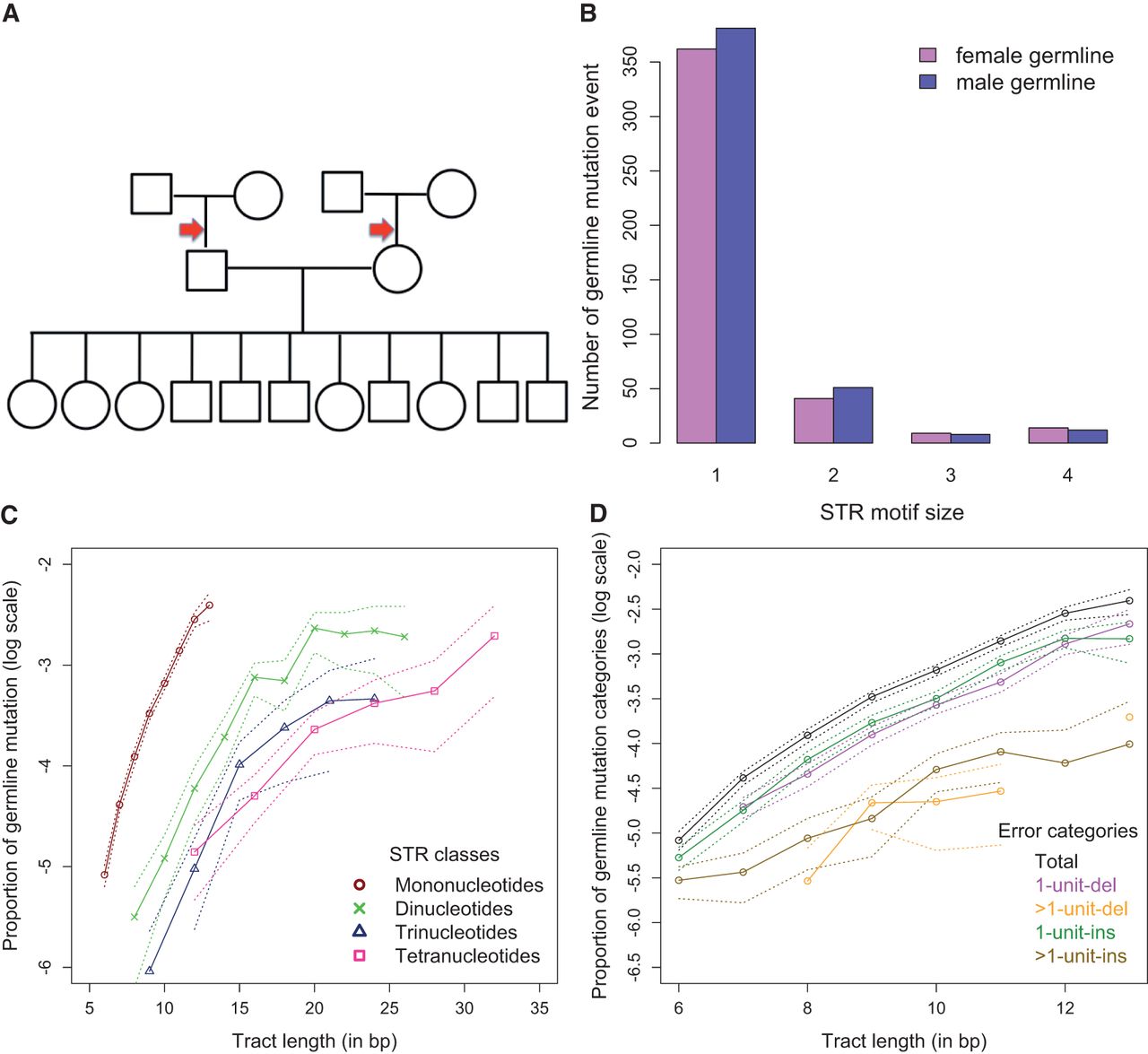 Germline mutation rate analyses using STR-FM. (A) Cartoon of the pedigree used, with arrows showing branches where mutations were detected. (B) The numbers of de novo mutations arising in the male and female germ lines. (C) The germline mutation rates for STRs with different length and motif size. The dotted lines represent the 95% confidence interval of the multinomial sampling. Only repeat lengths with ≥2000 loci support were plotted. (D) The frequencies of different mutation categories for mononucleotide STRs. The dotted lines represent 95% confidence intervals from multinomial sampling. Only repeat numbers with ≥2000 loci support were plotted.