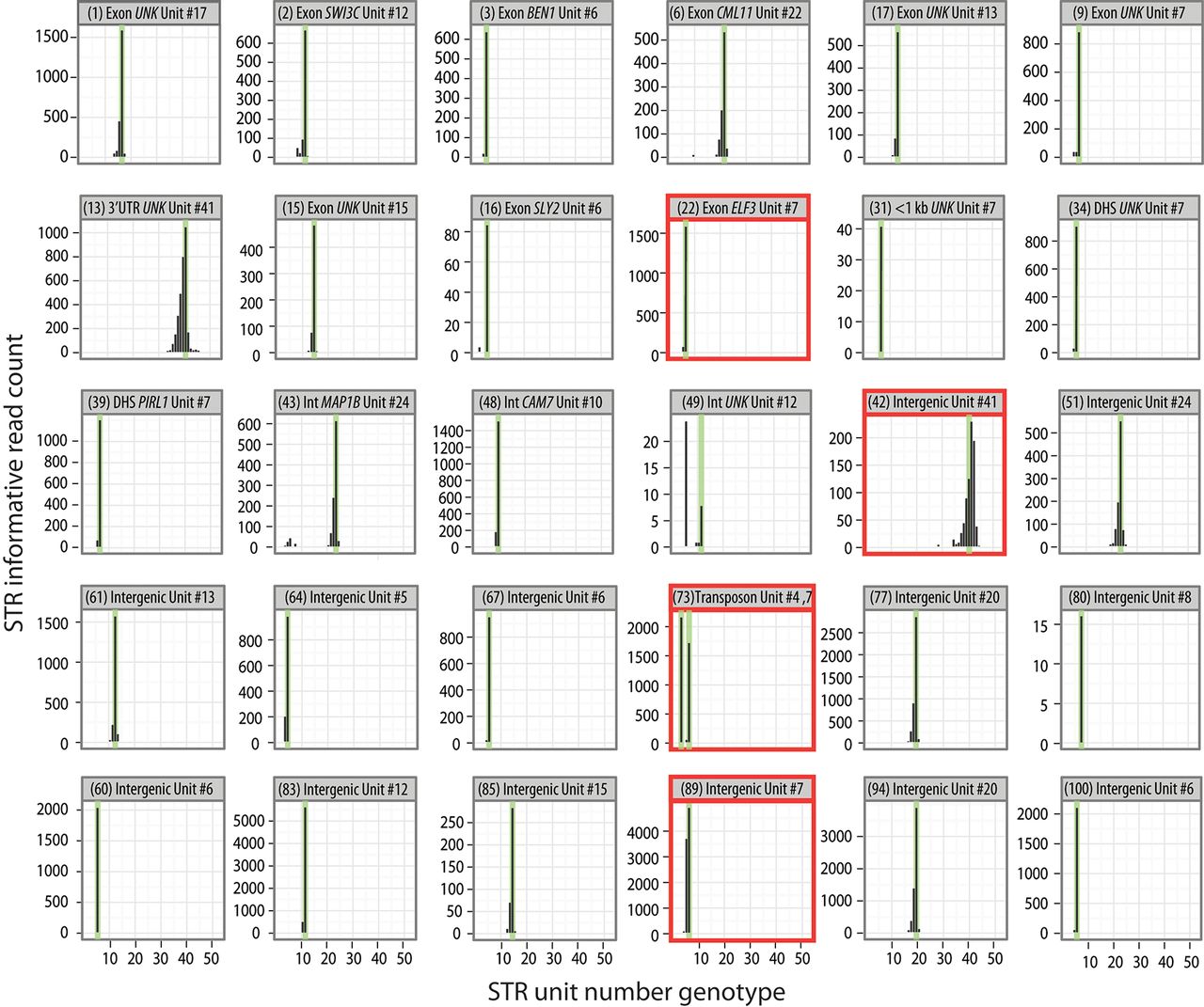 MIPSTR accurately determined germline STR unit number in the reference strain Col-0. Raw read counts at 30 representative STR loci, with reference genome STR unit number indicated in green. UNK indicates gene of unknown function. Numbers shown in parentheses refer to STR IDs (see Supplemental Table 1). Two instances of genomic duplication (residing in transposons) are shown (STR ID 73 and 89); both alleles showed comparable read counts. Note that erroneous calls show low read counts or high technical error. Bold red outlines indicate examples discussed further in the text.