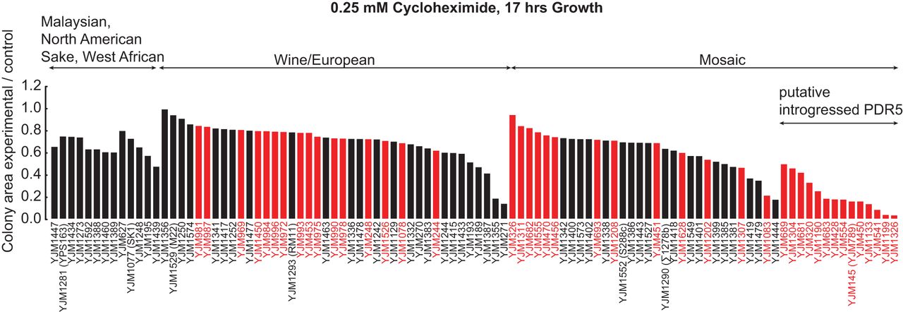 Cycloheximide resistance phenotypes of the 100-genomes S. cerevisiae strains. Colony area as a measure of cycloheximide resistance in 100 S. cerevisiae strains at 0.25 mM cycloheximide concentration. Strains are arranged according to the population structure, then to the presence/absence of the putatively introgressed PDR5, then to colony size. Strains having the putatively introgressed PDR5 are more sensitive to cycloheximide. Red bars denote clinical strains and black bars denote nonclinical strains.