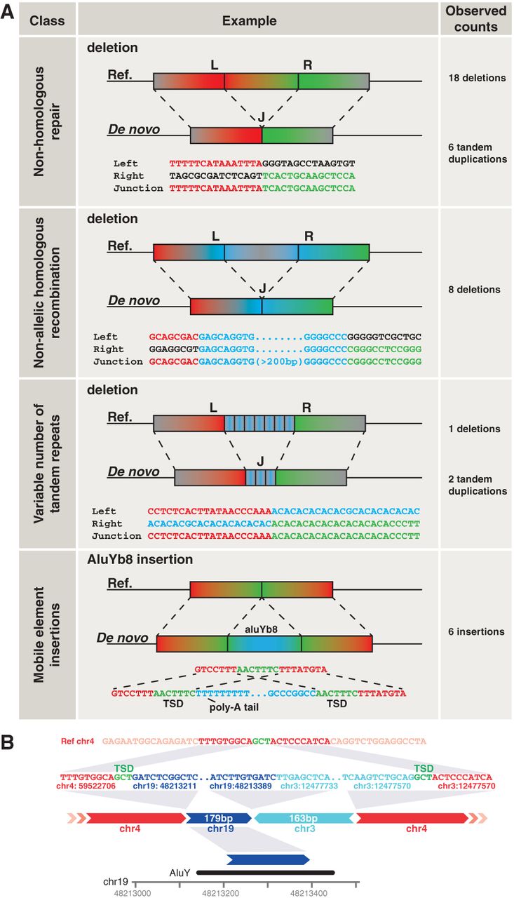 Mechanisms contributing to the formation of de novo SVs. (A) Overview of four SV formation mechanisms, including examples and observed counts for each of these. (L) Left flank, (R) right flank, (J) junction. (B) Schematic structure of a complex de novo interchromosomal SV involving an insertion of DNA from Chromosomes 3 and 19 into Chromosome 4. (TSD) Target site duplication.