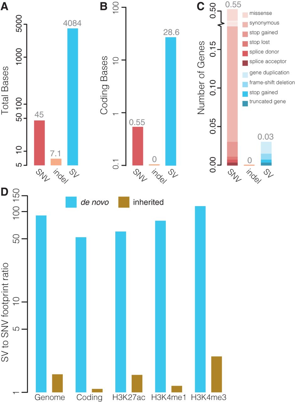 Functional impact of de novo indels and SVs. (A) Average number of genomic bases affected by de novo SNVs, indels, and SVs per child. (B) Average number of coding bases affected by de novo SNVs, indels, and SVs per child. (C) Average number of genes affected by de novo SNVs, indels, and SVs per child. The relative frequencies of the effects of the variations on the gene are indicated. (D) Comparison of the footprint of de novo (blue bars) and inherited (brown bars) large SVs (>20 bp) relative to the footprint of SNVs. The footprint was computed genome-wide, in protein-coding regions and genomic regions marked by H3K4me1, H3K4me3, and H3K27ac based on data from the ENCODE Project (The ENCODE Project Consortium 2007). The y-axis shows the ratio of the average number of affected bases per offspring relative to SNVs.