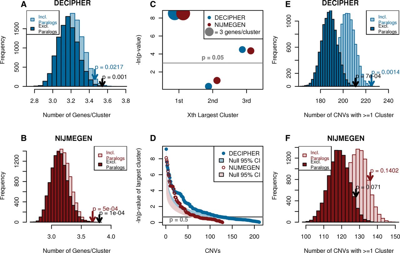 De novo CNVs from patients with developmental disorders contain significantly large numbers of functionally similar genes, as defined by proximity in the phenotypic linkage network (PLN). (Blue) DECIPHER, (red) NIJMEGEN. (A,B) DECIPHER (A) and NIJMEGEN (B) de novo CNVs contain significantly large functional clusters compared to 10,000 gene-number-matched randomizations, the significance of which increases when paralogous genes within the same CNV are collapsed to a single copy. Arrows indicate observed value and P-value. (C) The largest functional cluster is most significant in both data sets. The size of the circle indicates the average cluster size, light gray line indicates P = 0.05, and data sets are offset due to high overlap. (D) Thirty percent of de novo CNVs contain a functional cluster that is larger than expected (points, gray line indicate P = 0.5); shaded areas indicate 95% confidence intervals given a uniform distribution of P-values. The respective patients were not significantly enriched for any phenotype (hypergeometric test with Bonferroni correction). (E,F) More DECIPHER (E) and NIJMEGEN (F) de novo CNVs contain functional clusters compared to 10,000 gene-number-matched randomizations. Only DECIPHER was significantly different. Arrows indicate observed value and P-value.