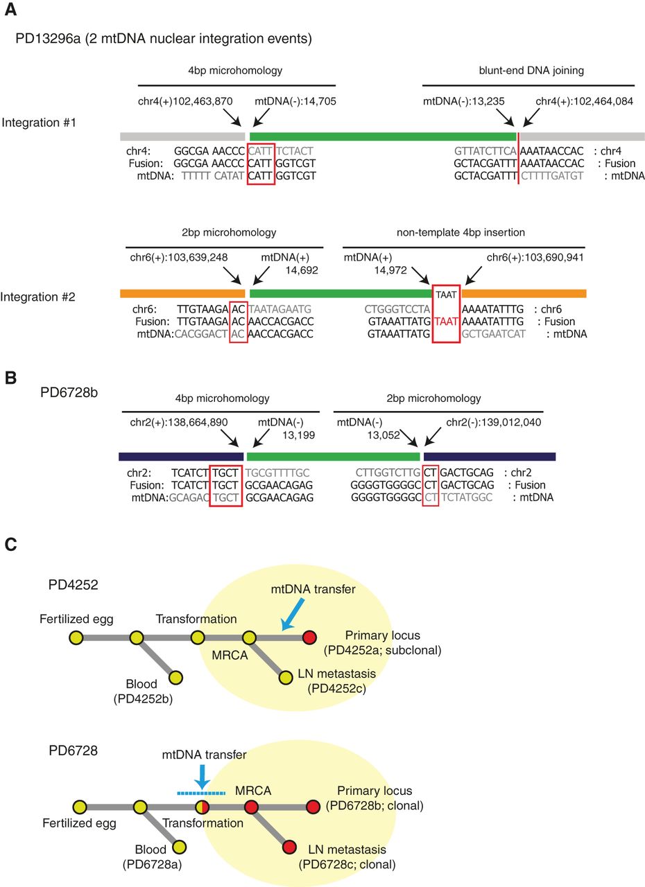 Nucleotide-resolution breakpoint sequences and the timing of somatic mtDNA nuclear integration. (A) Breakpoint sequences of nuclear-mtDNA fusions in PD13296a. Red rectangles highlight sequence microhomology and nontemplate nucleotides insertion. (B) Breakpoint sequences of nuclear-mtDNA fusions in PD6728b. Red rectangles highlight sequence microhomology. (C) Phylogenetic trees showing the timing of somatic mtDNA nuclear transfers in PD4252 and PD6728 samples. (MRCA) Most recent common ancestor cell.