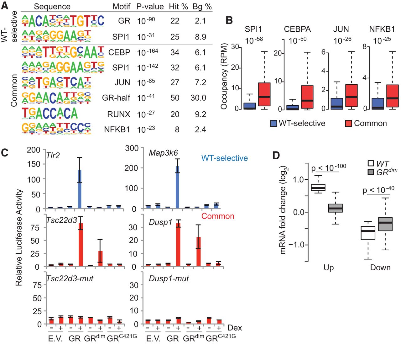 GRdim partitions the GR cistrome in primary macrophages. (A) Top-ranked de novo motifs from HOMER for the WT-selective and common GR binding sites from ChIP-seq in primary macrophages. Comprehensive motif results are reported in the Supplemental Material. (B) Box plots interrogating the co-occupancy of macrophage TFs at GR binding sites. (C) Regions named after the nearest gene that include WT-selective and common sites were assayed by a luciferase reporter in the absence (−) or presence (+) of dexamethasone (Dex) and cotransfection of empty vector (E.V.), GR, GRdim, or the DNA-binding mutant GRC421G. (D) Response of WT-regulated genes (up or down) from LPS- and dex-treated macrophages in GRdim-derived macrophages under the same treatment.