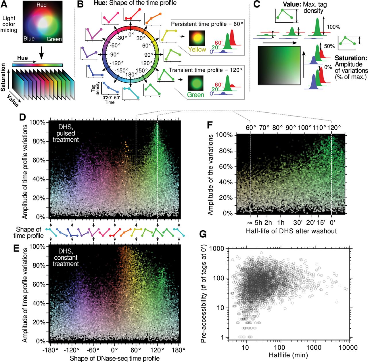 Hue-saturation-value (HSV) color-space interpretation of DHS time profiles. (A) The method presented here for analyzing time profiles is inspired from a color representation used in computer graphics that mimics our natural perception. Any color, i.e., any relative proportion of the three primary light colors (blue, green, and red) can be represented in this so-called HSV color space, yielding three parameters: hue, saturation, and value. This transformation is used here to interpret triplets of experimental data points (e.g., tag density at a DHS site at 0, 20, and 60 min over the course of an experiment) as if each of them were describing the intensity of a primary color. The resulting three parameters have the following interpretation: (B) “Hue” is a circular measure (i.e., an angle) that naturally sorts out as a single continuous variable all the possible shapes of the time profile, regardless of its minimal and maximal values. (C) “Saturation” and “Value” parameters describe the range over which the data points are spanning, independently of the shape of the profile. The “Value” is the maximum of all three time points, and the “Saturation” represents the amplitude of the variations as a fraction of the maximum (0% meaning no variations and 100% meaning the smallest time point is null). Using this representation, strong and highly responsive sites are bright and colorful, whereas dimmer colors mean fewer variations, and grayer colors mean weaker sites. (D,E) DHS time profiles are represented using the HSV method. (F,G) The partial recovery in the 60°–120° range can be mapped directly to a half-life of DHS, which can be further compared with preaccessibility levels (shown in G are only sites having at least a 25 tags increase between 0 and 20 min).