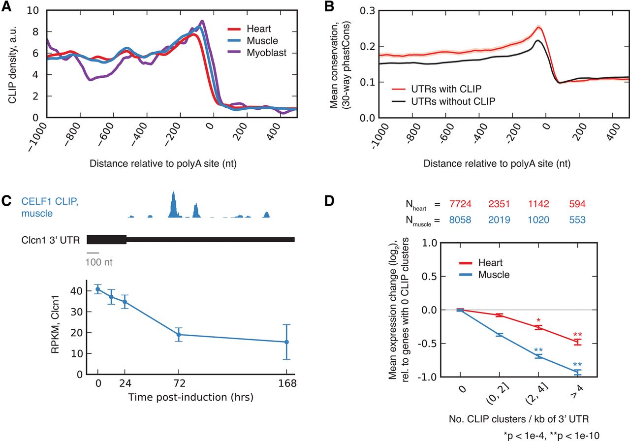 CELF1 binds to 3′ UTRs and regulates message stability in a dose-dependent fashion. (A) Mean CELF1 CLIP density at positions along 3′ UTRs in heart, muscle, and myoblasts. (B) Mean conservation in sets of 3′ UTRs with and without CELF1 CLIP clusters with similar expression levels and UTR lengths (shading represents SEM). (C) Expression of Clcn1 in muscle based on RNA-seq (mean ± SD) at various times following CELF1 overexpression (bottom); CLIP density in Clcn1 3′ UTR (top). (D) Mean log expression change following CELF1 induction (7 d over control) for transcripts grouped by number of CELF1 CLIP clusters in their 3′ UTRs. Transcripts with greater CLIP cluster density are down-regulated more strongly in heart and muscle (number of genes in each category listed above). Significance was assessed by rank-sum test, where each CLIP cluster bin was compared to the zero CLIP cluster bin. See also Supplemental Table S6.