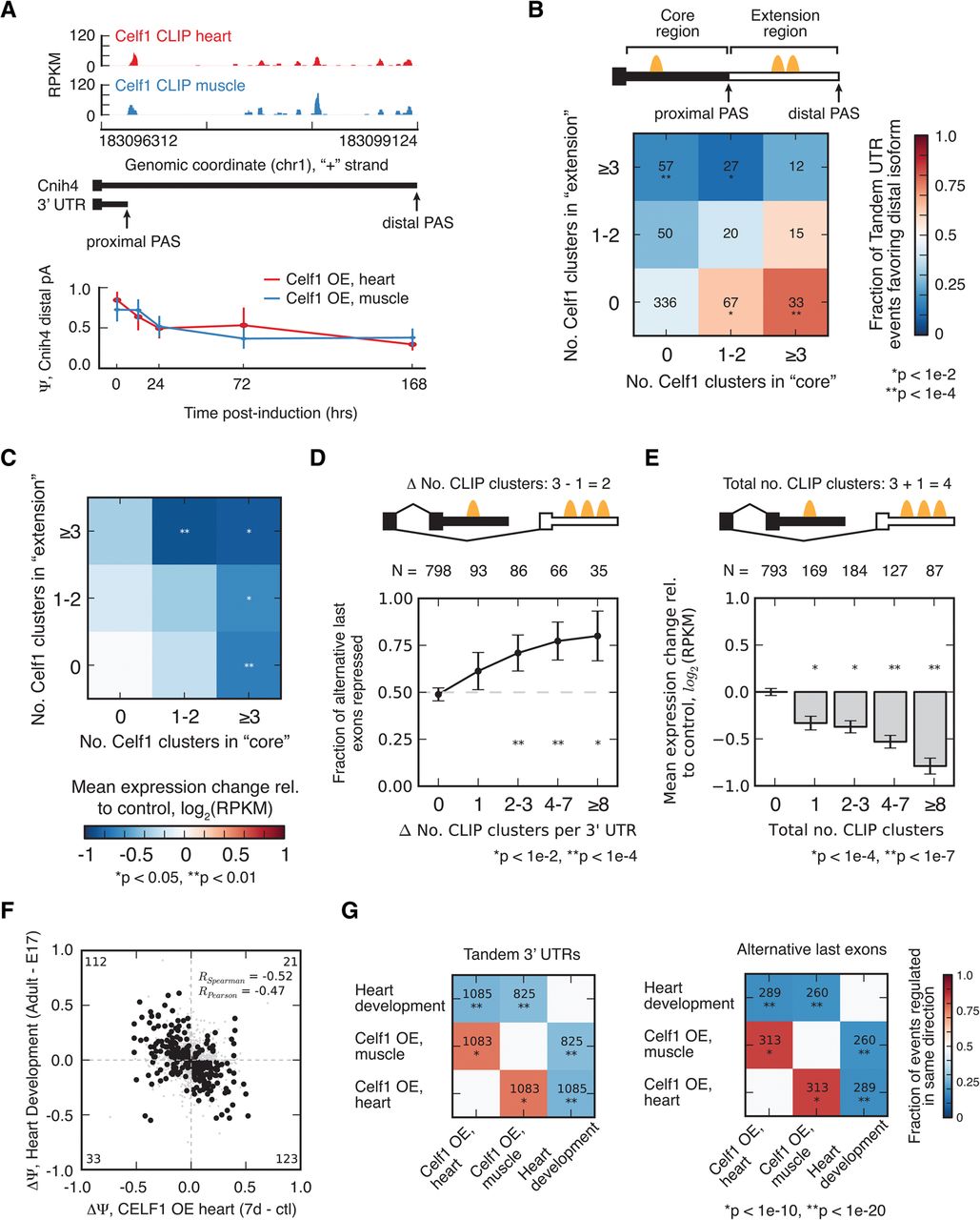 CELF1 regulates abundance of bound alternative 3′ UTRs, reversing developmental changes. (A) CELF1 CLIP-seq density in 3′ UTR of the Cnih4 gene, which has two alternative PASs whose relative abundance changes following CELF1 overexpression and during heart development. (B) CELF1 regulates tandem 3′ UTR events in a manner that is dependent on the number of binding sites in the core and/or extension region of the 3′ UTR. The heatmap shows the fraction of tandem UTR events biased toward usage of the proximal PAS following CELF1 overexpression in muscle for events grouped by the number of CLIP clusters in the proximal or distal region of the 3′ UTR (MZ > 1.6). Significance was assessed by binomial test, assuming equal likelihood for usage of long or short isoforms. (C) Messages with regulated tandem 3′ UTR events tend to be down-regulated following CELF1 induction. The heatmap shows the mean expression change following CELF1 induction in muscle for genes harboring events grouped by the number of CLIP clusters in the proximal or distal region of the 3′ UTR. Significance was assessed by rank-sum test, where each bin was compared to the bin with zero CLIP clusters. (D) CELF1 regulates ALE expression in a manner that is dependent on the number of binding sites in the competing 3′ UTRs. The fraction of ALEs that is significantly repressed following CELF1 overexpression in muscle, grouped by density in repressed 3′ UTR minus density in enhanced 3′ UTR (MZ > 1.5). Significance was assessed by binomial test, assuming equal likelihood for usage of each ALE isoform. (E) Messages with CELF1 binding within ALEs tend to be down-regulated following CELF1 induction. (Bar plot) Mean expression change following CELF1 induction in muscle for genes with varying numbers of CLIP clusters within ALEs. Significance was assessed by rank-sum test relative to genes with no CLIP clusters. (F) Changes in ALE usage during heart development inversely correlate with those that occur in response to CELF1 overexpression in heart. Correlation coefficients shown for events meeting a minimum Z-score threshold (heart development, 1.4; CELF1 OE, 1.8), as in Figure 1B. (G) Spearman correlation coefficients and significance of correlation are displayed in heatmap format for change in ALE usage (right) or change in tandem 3′ UTR usage (left) for pairwise comparisons of isoform changes during heart development, CELF1 overexpression in heart, and CELF1 overexpression in muscle. See also Supplemental Figure S6.