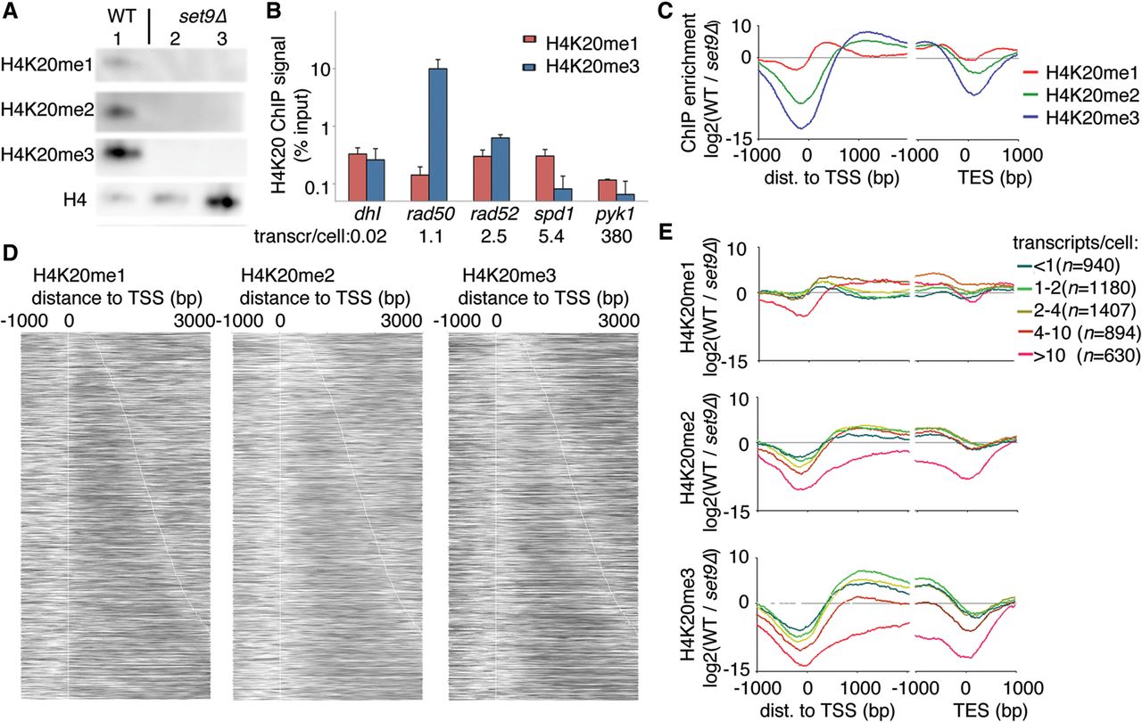 H4K20 methylation is found in protein-coding regions of the genome. (A) Western blot analysis of wild-type (WT) cells (lane 1) and set9Δ cells (lanes 2,3 differ in the amount of chromatin loaded). (B) ChIP-qPCR analysis of H4K20me1 and H4K20me3 at five loci that have different transcription levels. Bars show the average and SEM of three independent experiments. (C) The average pattern of H4K20 methylation marks aligned with the TSS (left) or TES (right). (D) Patterns of H4K20me1 (left), H4K20me2 (middle), and H4K20me3 (right) aligned at the TSS, with genes sorted according to length (top, short genes; bottom, long genes). (E) Metagene analysis of the levels of H4K20me1 (top), H4K20me2 (middle), and H4K20me3 (bottom), stratified according to gene expression level.