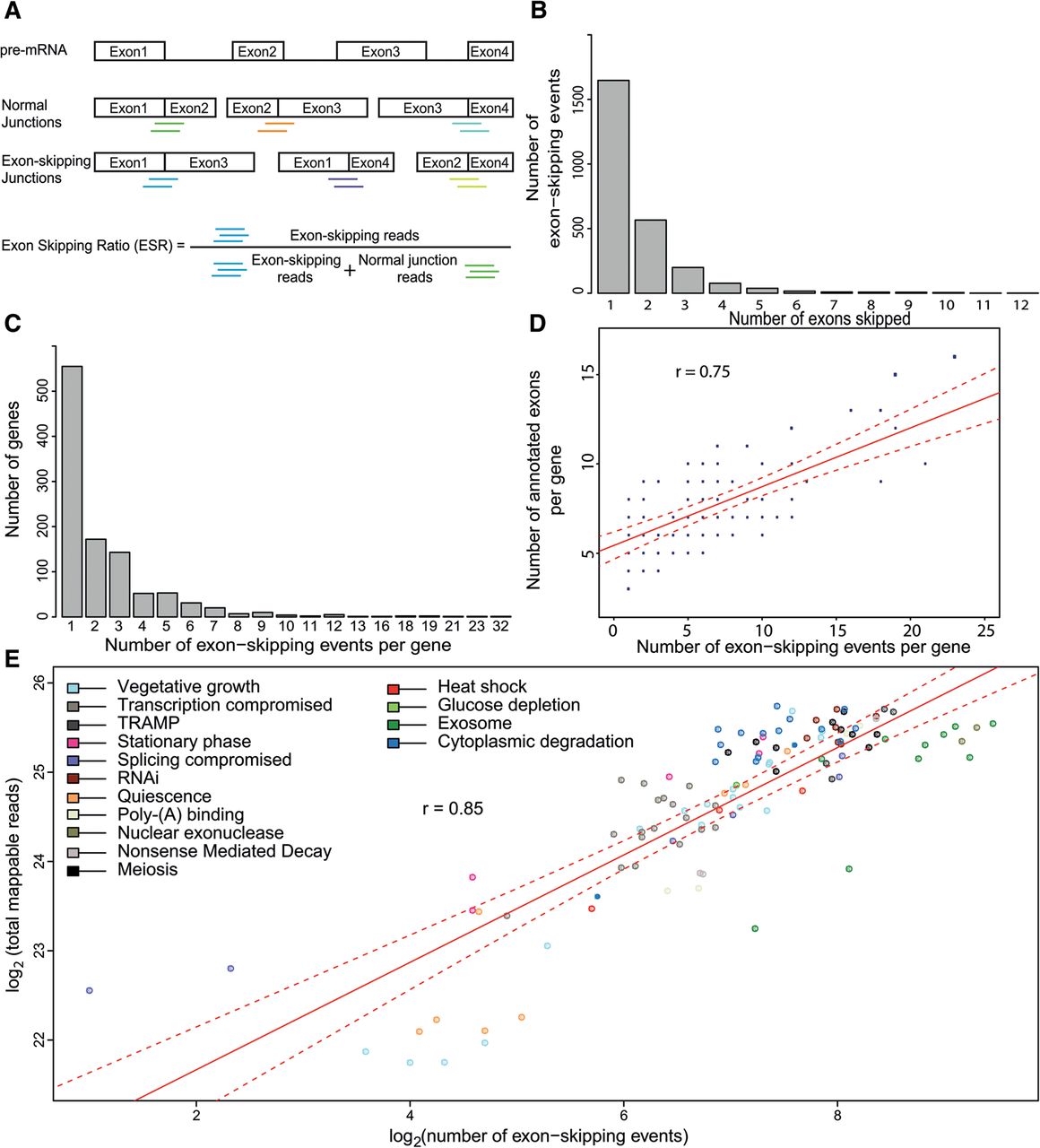 Identification and characterization of exon-skipping events using RNA-seq. (A) Scheme showing pre-mRNA (top) along with all possible normally spliced mRNAs and exon-skipping isoforms. The colored lines below the junctions represent diagnostic reads for normal exon–exon junctions (5′-3′; green, orange, cyan), and for exon-skipping junctions (5′-3′; blue, purple, light green). These diagnostic reads were used to calculate the exon-skipping ratio (ESR) and to identify splice isoforms. (B) Total number of exon-skipping events (y-axis) as a function of number of exons being skipped (x-axis; ranging from one to 12 skipped exons during a single event); 2574 skipping events are shown. (C) Maximum number of exon-skipping events recorded per gene (x-axis) as a function of gene number (y-axis). (D) Correlation between numbers of exon-skipping events per gene and numbers of annotated exons in the same gene. In total, 1063 genes were binned based on number of detected exon-skipping events and number of their annotated exons. The size of data points was scaled according to number of genes in each bin, i.e., normalized by number of genes in the genome containing a corresponding number of exons; (r) Pearson's correlation coefficient; (red line) fitted regression; (dotted red lines) 0.95 confidence levels. (E) Correlation between sequencing depth and number of exon-skipping events. Strains were grouped and color coded according to cellular function or condition tested (Supplemental Table S1); (r) Pearson's correlation coefficient; (red line) fitted regression; (dotted red lines) 0.95 confidence levels.