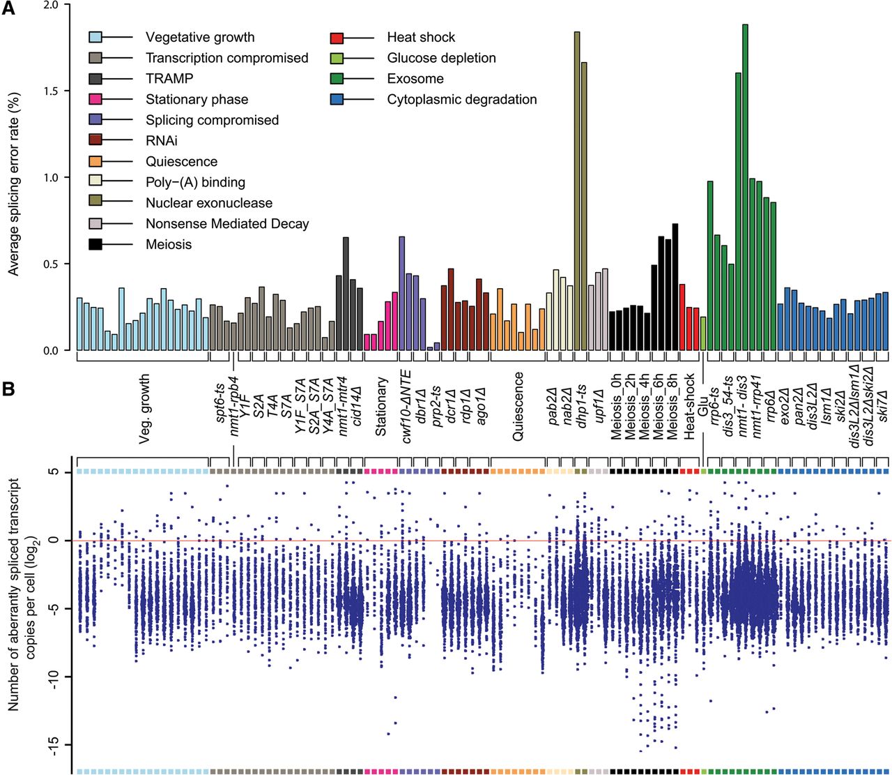 Splicing errors by exon skipping are eliminated by nuclear RNA surveillance. (A) Average splicing error for a given sample. Set of 2504 exon-skipping events for which both normal splicing and exon-skipping reads were identified in one or more samples. The splicing error rate for a locus is equal to corresponding local ESR (Supplemental Table S4). The values shown are averages of all local ESRs in a sample (Supplemental Table S7). Physiological conditions or mutants as indicated below were grouped and color coded according to cellular function or condition tested (Supplemental Table S1). (B) Number of aberrantly spliced transcripts per cell. To estimate this number, we multiplied local ESR for each exon-skipping event by corresponding transcript copy number (Supplemental Tables S8; Marguerat et al. 2012). Absolute cellular numbers of transcripts from growing cells were used as the gold standard for all samples, except for quiescence, where reported absolute numbers were used. Each blue point represents the copy number of an aberrantly spliced transcript. To avoid log2 of zero, exon-skipping events with local ESR/splicing error of zero were removed. Strains as indicated in A.