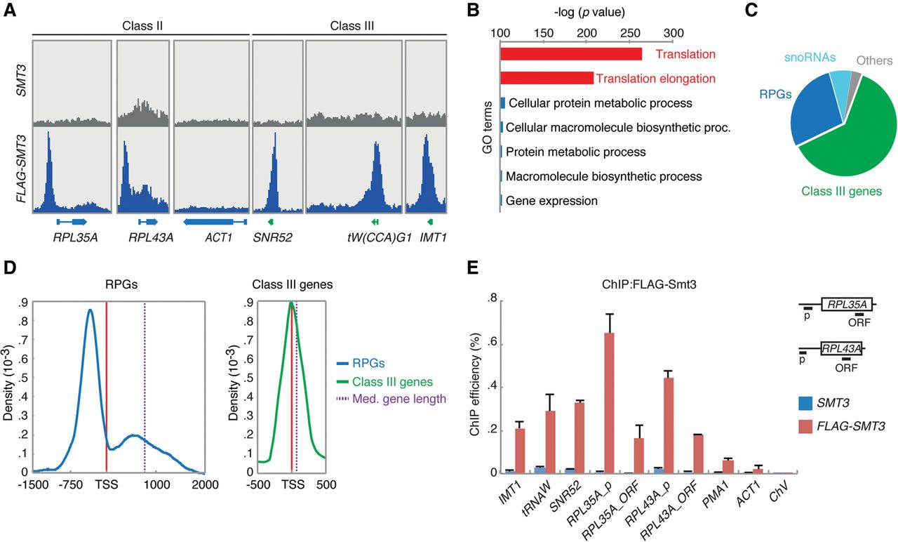 Sumo is enriched at class III genes and RPGs. (A) Snapshots of the Sumo ChIP-seq experiment with FLAG-tagged Sumo (FLAG-SMT3) and untagged control cells (SMT3). (B,C) GO analysis of the ChIP-seq data set reveals highly significant overrepresentation of genes involved in translation, such as RPGs and class III genes. (D) Metagene analysis of Sumo distribution patterns at RPGs and class III genes. (E) Validation of ChIP-seq data by conventional ChIP-qPCR. Error bars indicate SEM of three independent experiments.