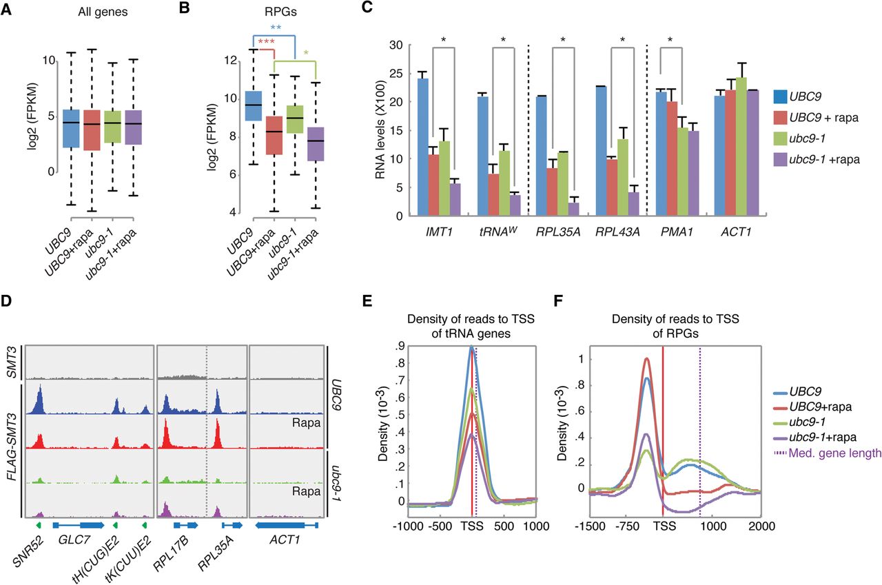 Ubc9 and TORC1 cooperate in regulation of transcription. (A) The global transcriptome is not affected by either Ubc9 or TORC1. WT cells and ubc9-1 mutants were treated for 30 min with 100 nM rapamycin (rapa) or with DMSO before RNA-seq. Potential differences between groups were tested with a two-sided Mann-Whitney U test. (B) Transcription of RPGs is regulated by both TORC1 and Ubc9. Cells were treated and RNA analyzed as in A. Differences between groups were tested as in A. (*) P = 0.008192; (**) P = 7.182 × 10−6; (***) P = 1.691 × 10−15. (C) Targeted qPCR experiment. Error bars, SEM of three independent experiments. (*) P < 0.01. (D) Snapshots of Sumo ChIP-seq in WT cells and ubc9-1 mutants treated with DMSO or rapamycin. (E,F) Metagene analysis of Sumo patterns at tDNA (E) and RPGs (F).
