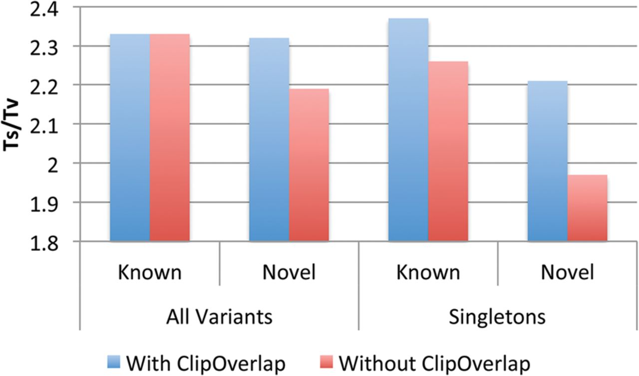 Comparison of known and novel Ts/Tv with and without trimming overlapping reads for 1000 low-coverage Chromosome 20 sequences from the 1000 Genomes Project. Overlapping fragments lowers novel Ts/Tv and the effect is more eminent in the singletons (with allele count of one).