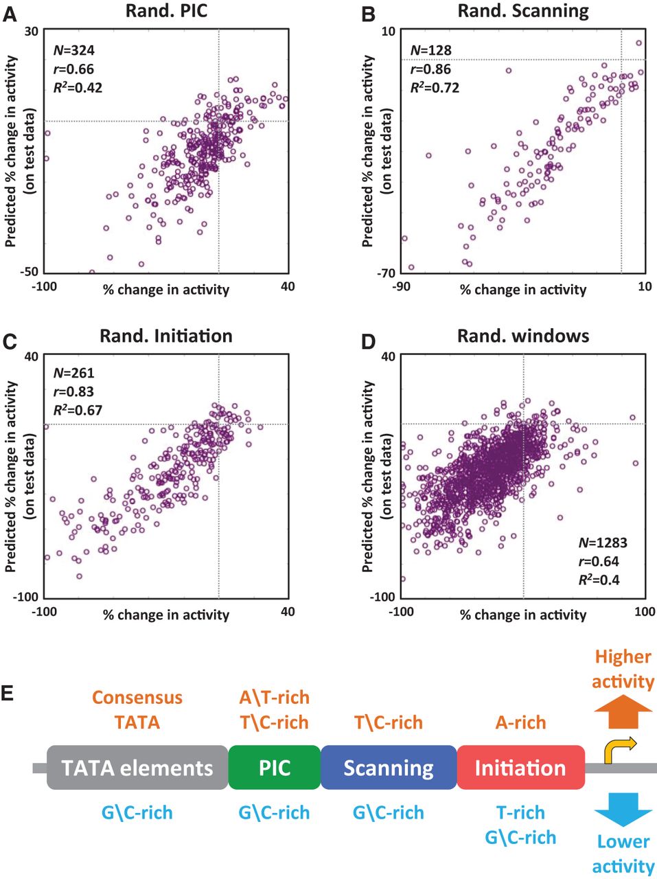 Sequence variation in different core promoter regions substantially affects activity. Results of learning linear models that predict the effects of mutating various native core promoter regions (see main text) on core promoter activity, based on sequence features that measure differences between mutant and native core promoters. We used a K-fold cross-validation scheme, such that each mutant appeared once in a held-out test set, and K − 1 times in a training set. (A) Results for PIC region mutations. For each mutated core promoter, we plotted its measured percent change (compared to the native core promoter) in core promoter activity (x-axis) against its predicted one (y-axis, predicted by the linear model learned when that mutant was part of the held-out test set). Gray lines mark the axes’ zero values. We also report mean performance measures (r and R2 statistics) of the models over the test sets. (B) Same as A for scanning region mutations. (C) Same as A for initiation region mutations. (D) Same as A for sliding window mutations. (E) An illustration summarizing classes of sequence features included in our linear models and their predicted effect on core promoter activity. All learned features are specified in Supplemental Figures 1–4. The golden right arrow marks the translation start site.
