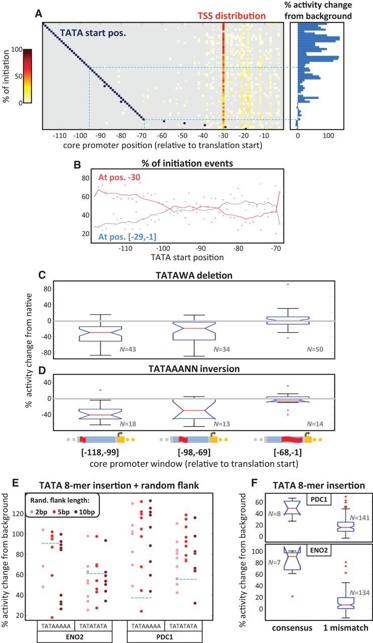 TATA element location, orientation, sequence, and flanking bases affect its functionality. (A) We inserted the TATA consensus 8-mer TATAAAAA into different positions along the PDC1 background sequence (see main text). Each row in the left panel heatmap corresponds to one insertion case, with TATA start position marked in dark blue (in a few cases, the insertion actually resulted in two overlapping TATA 8-mers, and then both start positions are marked), and the measured TSS distribution appearing in red and yellow (see color bar on the left). The effect of every insertion on core promoter activity is shown by the corresponding bar within the right panel. The light blue dashed lines separate the results of three regions: [−118,−96], [−95,−69], and the five insertion positions further downstream. Note that there are a few instances with missing TSS or expression data. (B) For the same data shown in A, an illustration of the percent initiation events (y-axis) at position −30 (red dots) vs. positions [−29,−1] (blue dots), as a function of the TATAAAAA 8-mer insertion start position (x-axis). The trend lines of corresponding colors show the moving average using a sliding window of length 10. (C) Box plots of the percent changes to core promoter activity caused by knockout mutations of native TATA elements having the consensus 6-mer TATAWA (W = A/T), in three core promoter windows: [−118,−99], [−98,−69], and [−68,−1]. Assignment to windows was based on the TATAWA start position. (D) Same as in C for inversions of native TATAAANN (N = A/C/G/T) 8-mers. (E) For insertions of the TATAAAAA and TATATATA consensus TATA 8-mers into position −98 of the ENO2 and PDC1 backgrounds, we also generated instances in which we additionally randomized their flanking sequences of lengths 2, 5, or 10 bp. For each such instance, we plotted the percent change to core promoter activity (y-axis). Pink, red, and dark red dots mark cases with random flanks of 2 bp, 5 bp, and 10 bp, respectively. Dashed light blue lines mark the value measured for insertions without flanking sequence randomization. (F) Box plots of the percent changes to core promoter-induced expression caused by insertion (into position −98) of either consensus TATAWAWR (W = A/T, R = A/G) 8-mers or TATA 8-mers that are one mismatch away from a consensus 8-mer. (Top) Insertions into the PDC1 background; (bottom) insertions into the ENO2 background.