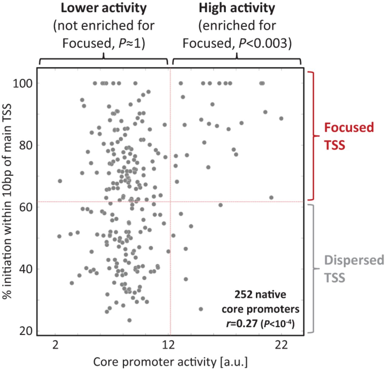 Highly expressed core promoters tend to have focused transcription initiation. A comparison of our core promoter activity measurements (x-axis) to our measure of focused transcription initiation (y-axis) for 252 native core promoters (taken from the union of the two sets in Fig. 2) reveals a significant correlation between the two measures. Based on the center values ([min. + max.]/2) of the two measures, native core promoters were classified as having either high or low activity (x-axis classification) and as having either focused or dispersed transcription initiation (y-axis classification). Core promoters with high activity were found to be enriched for focused transcription initiation.