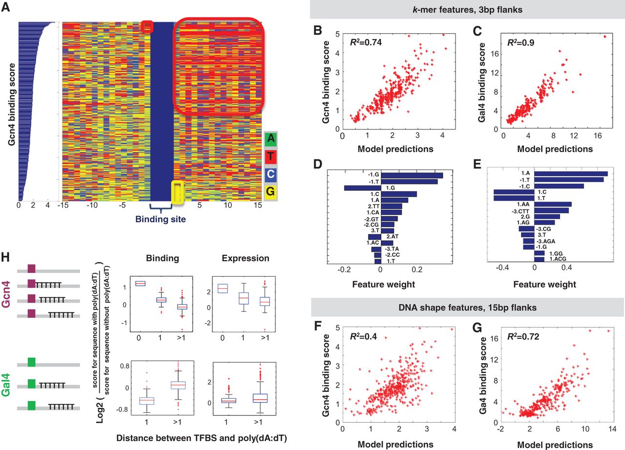 Computational models based on the flanking sequences of the core TFBS successfully predict differential binding to sequences that contain the same core binding site. (A) Shown are 412 sequences that contain the same strong Gcn4 site sorted by their binding score. We show the core TFBSs (in blue) and the identity of each nucleotide (color-coded) within 15-bp flanks upstream of and downstream from the site. Examples of specific flanking sequences that are enriched among the low or high scoring sequences are highlighted by colored squares. (B) Scatter plot of Gcn4 binding scores versus model predictions, with 3-bp flanks, based on the 1mer + 2mer model. (C) Same as B but for Gal4. (D) Feature weights for the top 15 sequence features for the model in B. (E) Feature weights for the top 15 sequence features for the model in C. (F) Scatter plot of Gcn4 binding versus model predictions, with 15-bp flanks, DNA-shape-based model. DNA shape features are minor groove width, roll, propeller twist, and helix twist (Yang et al. 2014). For each of these features, the model includes a value computed per bp (minor groove width and propeller twist) or bp step (roll and helix twist) derived from a 5-bp window surrounding that bp using DNAshape (Zhou et al. 2013), a mean value across the 15-bp downstream flanks, the 15-bp upstream flanks, and the concatenated 30-bp flanks. (G) Same as F but for Gal4 binding. (H) Boxplots of log2 of the binding score (left) or expression levels (right) of sequences with 15-bp poly(dA:dT) tracts, at different distances from a strong Gcn4 or Gal4 TFBS, divided by the binding score/expression levels of the same sequence without the poly(dA:dT) tract.