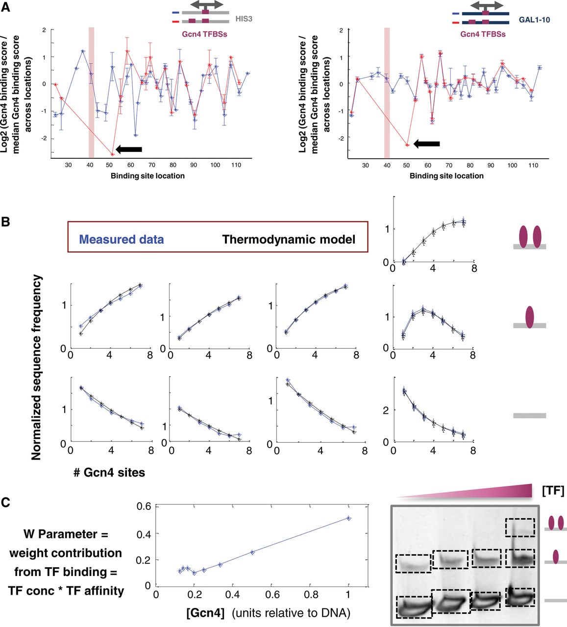 A simple thermodynamic model of TF binding as a function of TF concentration. TFBS multiplicity accounts for the binding measurements. (A) A set of sequences with a strong Gcn4 site placed at different locations along a specific sequence context, either in the presence of an additional strong Gcn4 site located in a fixed location (with the pink rectangle marking the location of the center of this site) (in red) or without this additional site (in blue). Shown is the log2 of the ratio of the binding score attained by each sequence (with the x-coordinate marking the location of the center of the site) divided by the median binding score across all sequences in this set. The binding score for the sequences with a single site is computed based on a band representing a single TF binding (see the band marked by a blue square in Fig. 1), while the binding score for sequences with two sites is computed based on the band representing two TF binding events (see the band marked by a red square in Fig. 1). The black arrow points to a sequence where the 9-bp sites are separated by a single bp. Sequences with Gcn4 TFBSs of 9 bp placed along the HIS3-derived context (left panel) and along the GAL1-10–derived context (right panel). (B) For a set of sequences with all possible combinations of one to seven binding sites for Gcn4 in seven predefined locations, the average frequency of sequences in different bands (“binding states”) is shown as a function of the number of sites within the sequence (in blue). The graphs correspond to the bands displayed in the gel in the right bottom corner. A detailed description of the plotted “normalized sequence frequency” measure can be found in Supplemental Section C. The predictions of these dependencies based on a simple thermodynamic model assuming multiple TF binding events are independent (for detailed description, see Supplemental Section C) and are also plotted (in black). (C) For the single parameter in the thermodynamic model, which represents the weight contribution of a TF binding event and is expected to be proportional to the TF concentration, the value used in the model that best fits the measured data is plotted against a measure of the concentration of Gcn4 that was actually used in the experiments presented here.