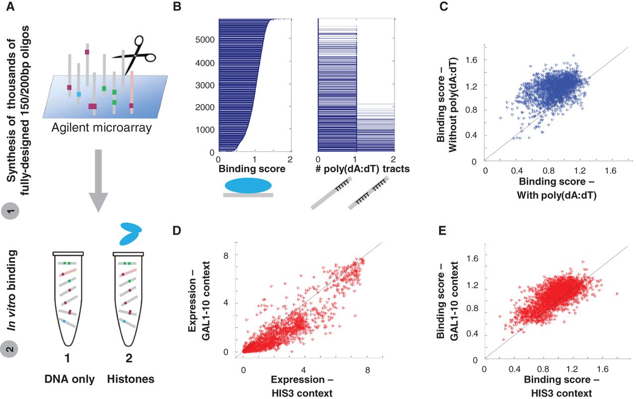 Nucleosome sequence preferences captured by BunDLE-seq suggest additional mechanisms underlying expression differences between different regulatory sequences. (A) Schematic illustration of the application of BunDLE-seq with histones. (B) Sequences were sorted according to the nucleosome binding score (computed based on the histones-bound band). (Right) For each sequence, we show the number of 15-bp poly(dA:dT) tracts that it contains. (C) Scatter plots of nucleosome binding scores for sequences with a 15-bp poly(dA:dT) tract versus the binding score of the corresponding sequences lacking this tract [among 1972 pairs tested, for 1843 the sequence without the poly(dA:dT) tracts showed a higher binding score than a corresponding sequence with the tract]. (D) Scatter plot of the expression measurements of sequences with the HIS3-derived context versus the corresponding sequences (i.e., containing the same set of regulatory elements placed at the same locations along the sequence) with the GAL1-10–derived context (with 71% below the line). (E) Scatter plots of nucleosome binding scores for the same sequences shown in D (with 80% above the line).