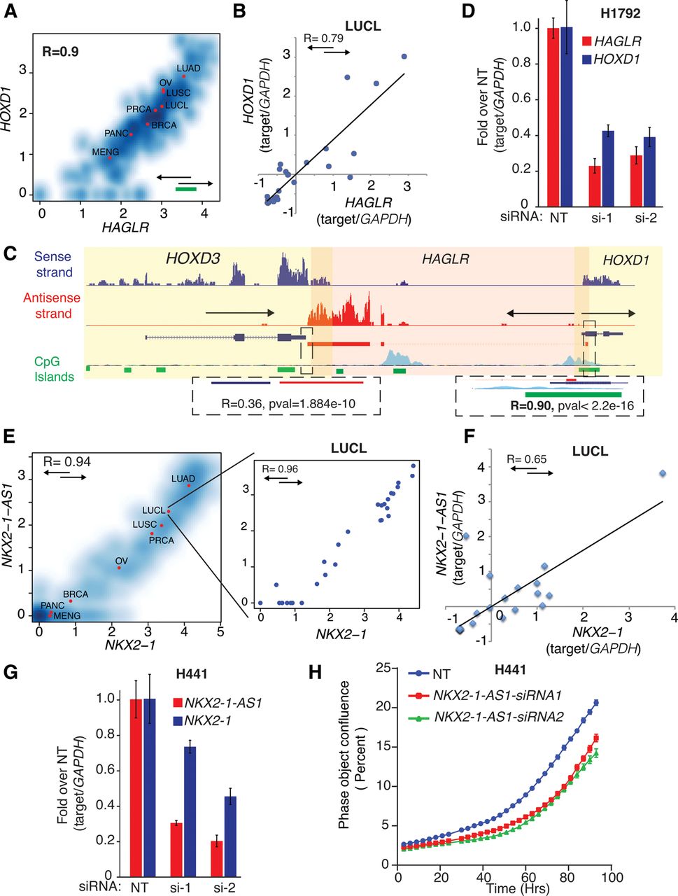Antisense regulation of cognate sense genes. (A) Density scatter plot for HOXD1/HAGLR expression across the compendium. The units of the x- and y-axis are log10[norm(count)], and red dots indicate the average value for each cohort. (B) HOXD1 and HAGLR expression measured by quantitative PCR across a cohort of 29 lung cell line samples. (C) Representative example of tight coexpression of HTH cis-NAT gene pairs. Loci containing HOXD1/HAGLR/HOXD3 in PRCA sample (mctp_sample_337) is illustrated. Read support for expression in the sense and antisense strands is shown as tracks in blue and red, respectively. Transcript structure, CpG islands (green boxes), and H3K27ac (light blue) tracks are obtained from the UCSC Genome Browser (https://genome.ucsc.edu/) (Karolchik et al. 2014). Yellow and light red shadows represent the limits of sense and antisense genes, respectively. HOXD1/HAGLR HTH gene pair is tightly coexpressed: (right inset) R = 0.90; P-value ≤ 2.2 × 10−10. These transcripts share an overlapping region containing CpG islands, suggesting a bidirectional promoter. HOXD3/HAGLR, on the other hand, form a TTT gene pair with a lower coexpression pattern ([left inset] R = 0.36; P-value = 1.9 × 10−10) and no CpG islands in the overlapping region. (D) Knockdown of HOXD1-AS1 in the H1792 cell line, which expresses HOXD1 sense/antisense transcripts with two independent specific siRNAs. Knockdown decreases the expression levels of both the antisense (HOXD1-AS1) and the cognate sense genes (HOXD1). (E) Density scatter plot for the expression of NK2 homeobox 1 (NKX2-1), master regulator essential for lung development, and NKX2-1-AS1 (R = 0.94). In the inset, a density scatter plot showing only the sense and antisense expression for the samples in the ssRNA-seq lung cell line cohort (R = 0.96). The units of the x- and y-axis are log10[norm(count)], and red dots indicate the average value for each cohort. (F) NKX2-1 and NKX2-1-AS1 expression measured by quantitative PCR across a cohort of 29 lung cell line samples. (G) Knockdown of the antisense gene NKX2-1-AS1 with two independent and specific siRNAs decreases the expression level of their cognate sense gene NKX2-1 in H441, a cell line that expresses both transcripts (see also Supplemental Fig. S8). (H) Knockdown of the antisense gene NKX2-1-AS1 with two independent siRNAs impairs proliferation of the H441 cell line. The y-axis, “Phase object confluence,” is a label-free measure of cell confluence used for IncuCyteZOOM live-cell imaging platform to assess the cell growth.