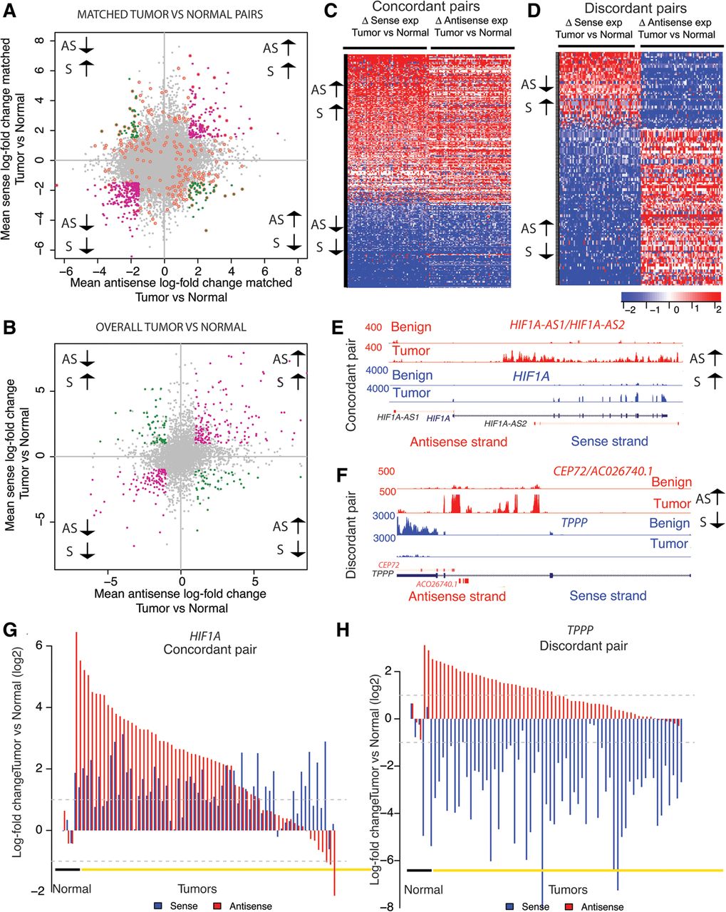 Antisense loci dysregulation in cancer. The expression of the two genes in a cis-NAT pair can both change in a concordant (same direction) or discordant (in opposite direction) manner, when comparing tumor versus normal samples (see Methods). (A) Mean sense expression of log-fold change versus mean antisense expression of log-fold change between matched pairs of lung tumor-normal samples (n = 6 samples, three pairs). Gray dots represent unchanged pairs; green dots, discordant loci; purple dots, concordant loci. A dot is colored orange if the relationship is observed in only one of the tumor-normal matched pairs. (B) Mean sense expression of log-fold change versus mean antisense expression of log-fold change between LUAD tumor (n = 66) and normal samples (n = 3). Color code as in A. (C) Heatmap of cancer-specific concordant cis-NAT pairs. The log-fold change expression between tumor (n = 66) and normal samples (n = 3) for the sense and antisense gene is displayed. Loci are represented in the rows and samples in the columns. Loci are sorted in decreasing order according to average log-fold change across all samples. The color scale ranges from blue (−2) to red (2), in units of log-fold change expression. (D) Heatmap of cancer-specific discordant cis-NAT pairs. The log-fold change expression between tumor (n = 66) and normal samples (n = 3) for the sense and antisense gene is displayed. Loci are represented in the rows and samples in the columns. Loci are sorted in decreasing order according to average log-fold change across all samples. The color scale ranges from blue (−2) to red (2) in units of log-fold change expression. (E) Coverage map for a representative example of a concordant cis-NAT pair (HIF1A). Coverage maps in benign and tumor samples in both sense and antisense strands in the HIF1A locus are presented as individual tracks above the gene schematic. Values on the left indicate track heights. (F) Coverage map for a representative example of a discordant cis-NAT pair (TPPP/CEP72). Coverage maps in benign and tumor samples in both sense and antisense strands in TPPP/CEP72 loci are presented as individual tracks above the gene schematic. Values on the left indicate track heights. (G) Bar plot of the ssRNA-seq expression log-fold change between tumor and normal samples for the concordant pair HIF1A/HIF1A-AS. Red bars indicate antisense expression and blue bars indicate sense transcript expression. (H) Bar plot of the ssRNA-seq expression log-fold change between tumor and normal samples for the discordant pair TPPP/CEP72. Red bars indicate antisense expression and blue bars indicate sense transcript expression.