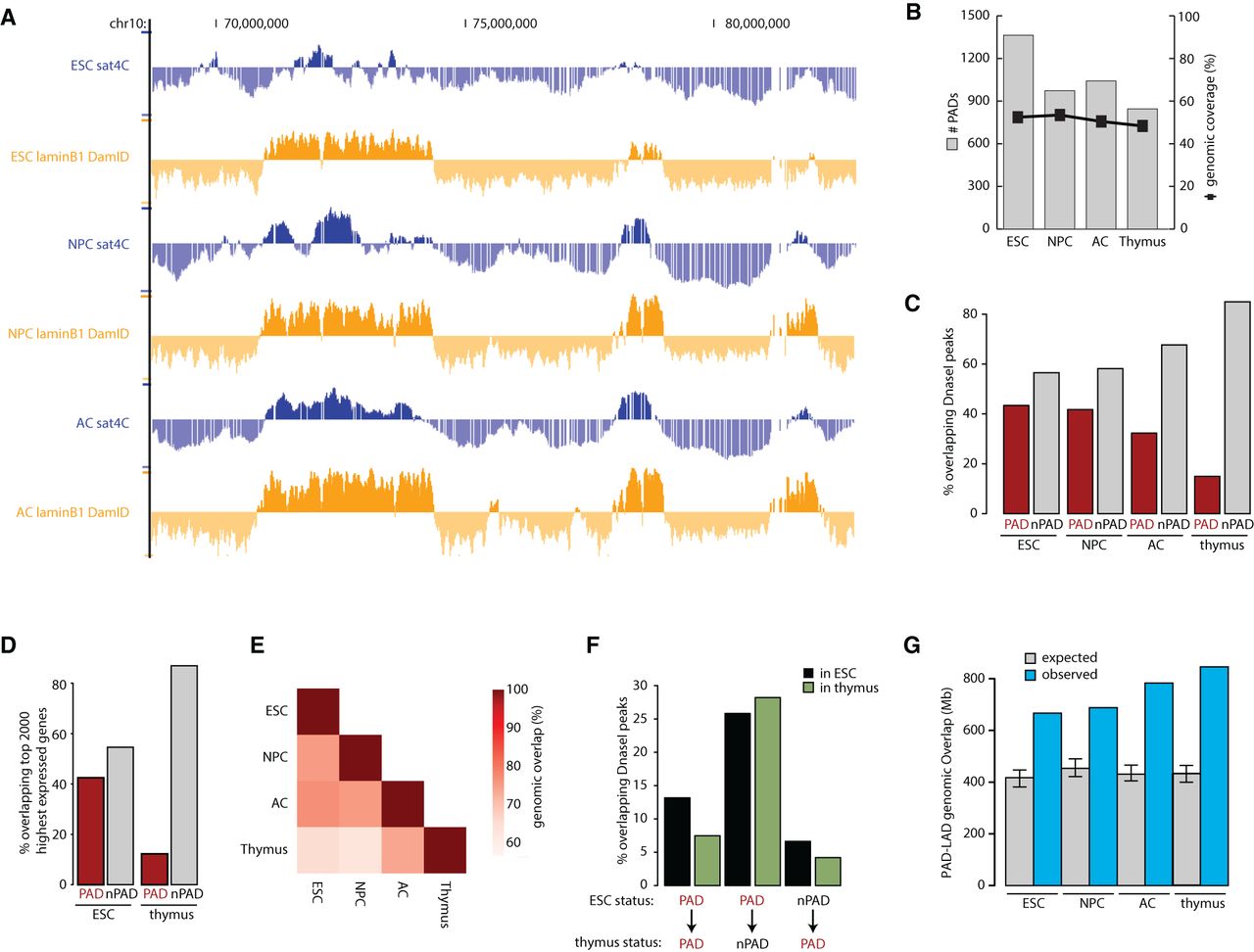 Segregation of inactive chromatin around chromocenters is established during lineage commitment. (A) Comparison of sat4C (blue) and Lamin B1 DamID (orange) profiles (taken from the UCSC Genome Browser) for the same genomic region in ESCs, NPCs, and ACs. (B) Histogram showing the number of PADs and the genomic coverage in each cell type. (C) Distribution of clusters of DNase I hypersensitive sites (hotspots) across PADs and non-PADs in each cell type. (D) Distribution of the top 2000 expressed genes across PADs and non-PADs in ESC and thymus. (E) Heatmap showing pairwise genomic PAD overlaps between all tissues examined as a percentage of PADs in the labeled tissues below the heatmap. (F) Comparison of DNase I hypersensitive sites in ESC and thymus for constitutive PADs, ESC-specific and thymus-specific PADs. (G) Histogram plot showing PAD-LAD overlap as genomic coverage (blue) and the 99% confidence intervals for expected overlap (gray with error bars) in each cell type based on randomization.