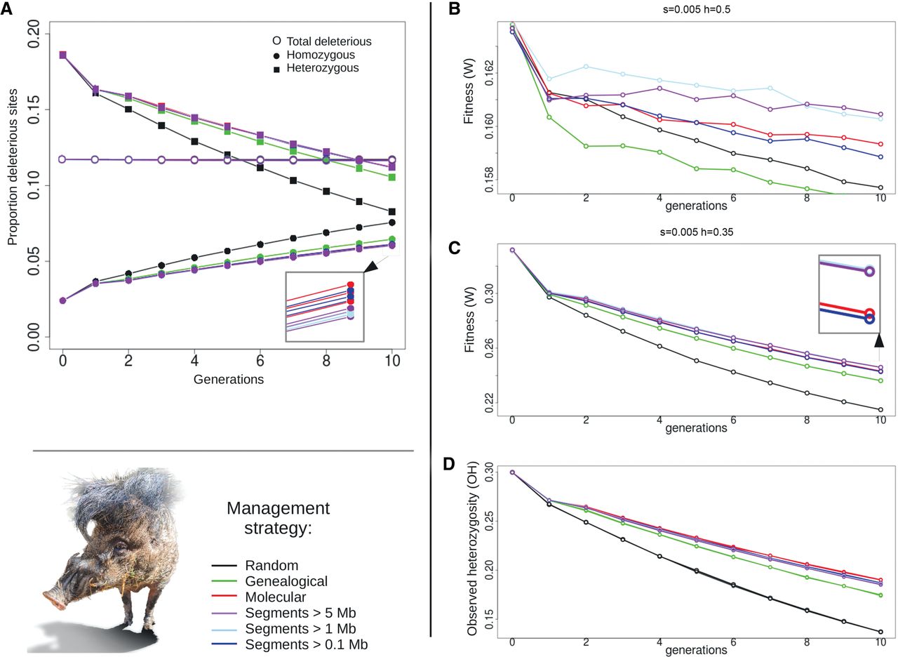 Fitness and diversity during management of the S. cebifrons population. The change in fitness and observed heterozygosity (OH) during 10 generations of management is displayed for five different management strategies. (A) The proportion of deleterious sites is displayed on the y-axis and the generations are shown on the x-axis for the scenario in B (s = 0.005 and h = 0.5). Deleterious sites are split into homozygous sites (filled circles), heterozygous sites (filled squares), and the total number of deleterious sites (open circles). (B) Fitness change over 10 generations of management when a dominance coefficient of 0.5 is applied. (C) Fitness change over 10 generations of management when a dominance coefficient of 0.35 is applied. (D) Observed heterozygosity during 10 generations of management.