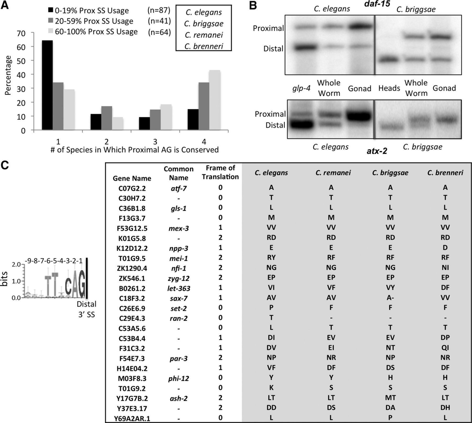 Adjacent alternative 3′ splice sites are conserved in related Caenorhabditis species. (A) Bar graph depicting conservation of the proximal AG dinucleotide in tissue-specific alternative 3′ splice sites. Introns were separated according to percent of proximal 3′ splice site usage in the wild-type germline (0%–19% in black, 20%–59% in dark gray, and 60%–100% in light gray). The comparison is made with three species related to C. elegans: C. remanei, C. briggsae, and C. brenneri. Displayed is a bar graph depicting the percentage of events in each category in which the upstream AG dinucleotide is conserved in only C. elegans (1) or in C. elegans plus one, two, or three other related species (2, 3, and 4). (B) 32P-labeled RT-PCR products made from primers that flank introns in daf-15 and atx-2 with tissue-specific alternative adjacent 3′ splice sites. Enrichment in C. elegans or C. briggsae for somatic cells (glp-4 or dissected heads, respectively) and germline cells (dissected gonads) shows a shift in abundance from the distal site isoform to the proximal site isoform in the germline of both species. (C) WebLogo consensus sequence motif of the 9 nt preceding the distal 3′ splice site of the 53 introns with tissue-specific 3′ splice sites separated by 9 nt (from Supplemental Table S2). Note the lack of conserved nucleotides at positions −7 to −9 from the distal 3′ splice site. On the right, a table depicting the 24 introns with the AG dinucleotide at the proximal site 9 nt upstream of the distal splice site conserved in all four nematode species analyzed. Shown is the gene name, common name, the frame of translation, and the identity of the amino acid(s) derived from the −7 to −9 nt.