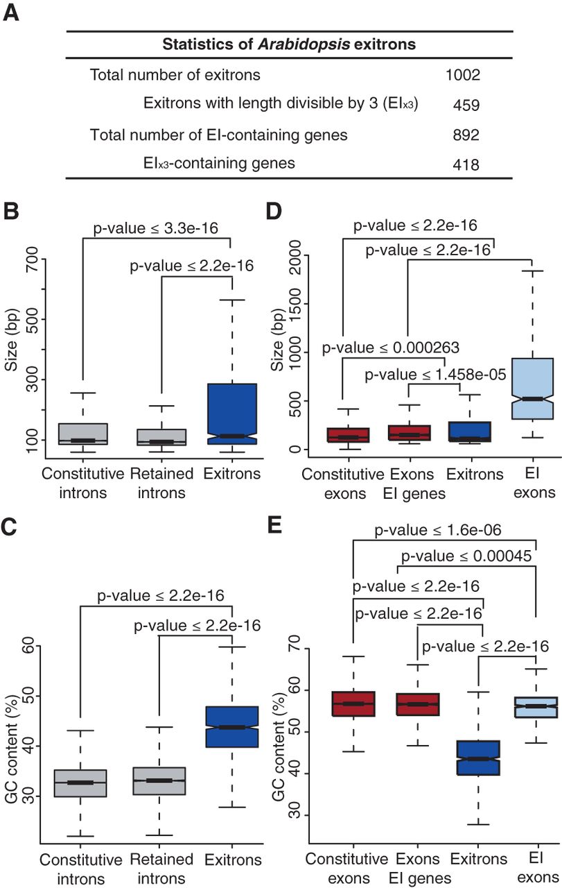 Statistics and features of Arabidopsis EIs. (A) General statistics of Arabidopsis exitrons. (B,C) Comparisons of size distribution (B) and GC content (C) of exitrons and introns. (D,E) Comparisons of size distribution (D) and GC content (E) of exitrons and exons. (B–E) Data presented as Tukey box plots.