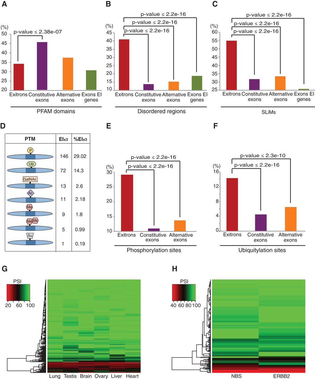 Functional implications of EIS in human. (A–C) Enrichment of PFAM domains (A), disordered regions (B), and SLiMs (C) in protein sequences encoded by EIs and other types of exons. (D) Statistics of various post-translational modification (PTM) sites encoded by EIs. (E,F) Enrichment of phosphorylation (E) and ubiquitylation (F) sites in the sequences encoded by EIs and other types of exons. (A–F) Analyses performed for EIx3 subset only. (G,H) Heatmap of EIS (measured by PSI) in different human tissues (G) and in ERBB2-positive breast cancer and normal breast tissue (NBS) samples (H).