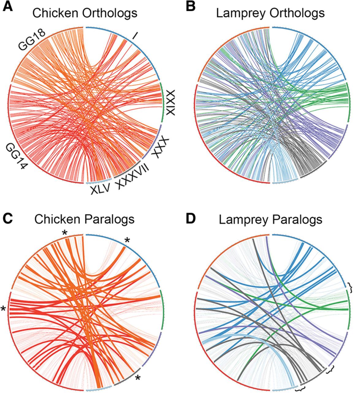 Distribution of individual orthologous genes across paralogous chicken and lamprey chromosomes. (A) Orthologs from chicken chromosomes GG14 and GG18 are distributed across five lamprey LGs (the complete set of lamprey linkage groups with significant enrichment for orthologs on these two chicken chromosomes). (B) Orthologs from these LGs are distributed across GG14 and GG18 (the complete set of chicken chromosomes with significant enrichment for orthologs on these lamprey linkage groups). (C) Orthologies plotted in A, with retained chicken paralogs denoted by bold lines. (D) Orthologies plotted in B, with retained lamprey paralogs denoted by bold lines. Roman numerals designate lamprey LGs. Asterisks mark the location of four conserved paralogs that are derived from a single gene located on ancI. Brackets denote presumptive ancestral linkages that are supported by the distribution of paralogous genes.