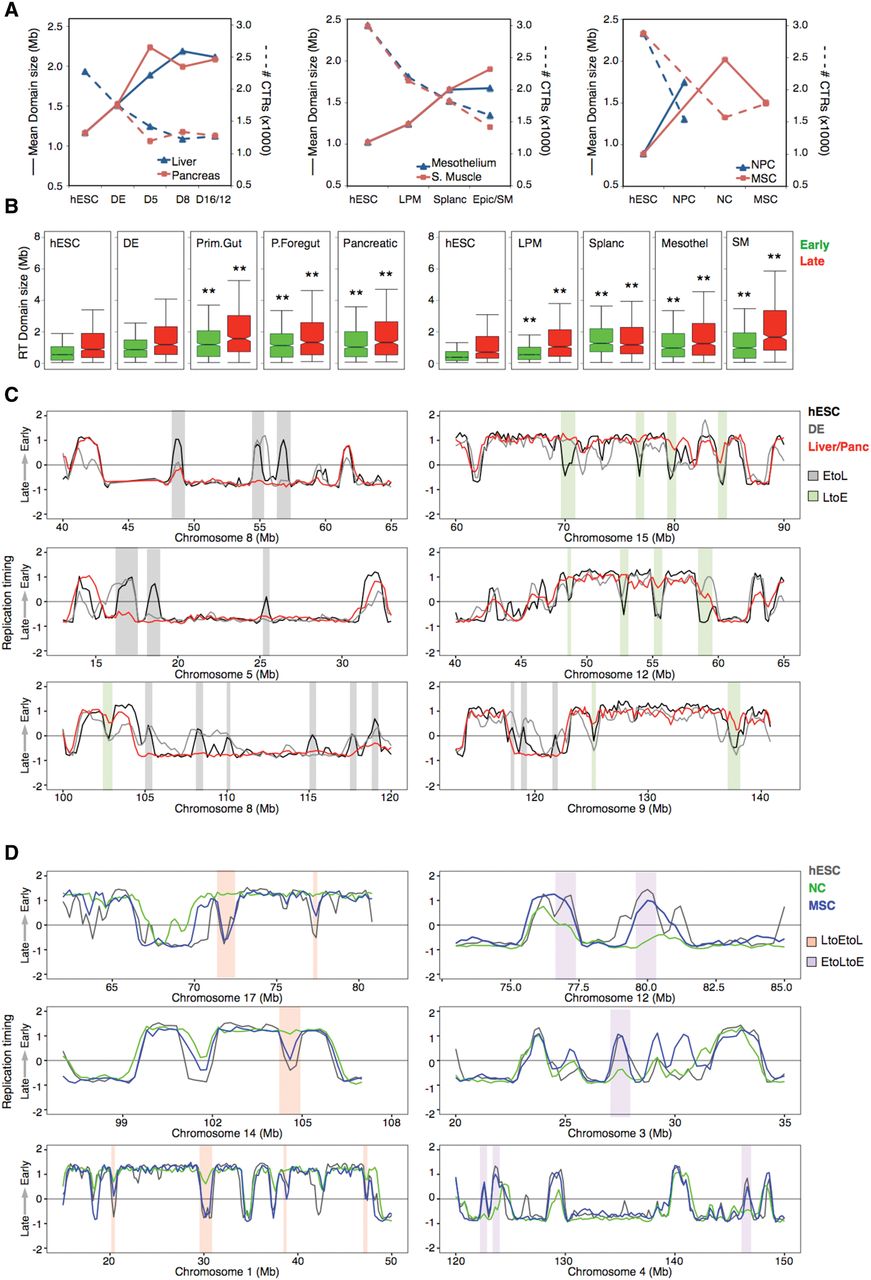Replication domain (RD) reorganization during hESC differentiation. (A) Number and sizes of constant timing regions (CTRs) in the distinct pathways. Solid lines depict the average size of the CTRs, whereas dashed lines depict the total number of CTRs in each cell type. (B) Sizes of early and late replicating CTRs during differentiation toward pancreas, mesothelium, and smooth muscle: (**) P ≤ 0.01 compared to hESC. (C) Representative RD consolidation during hESC differentiation. (D) Deconsolidation of RD during MSC differentiation.