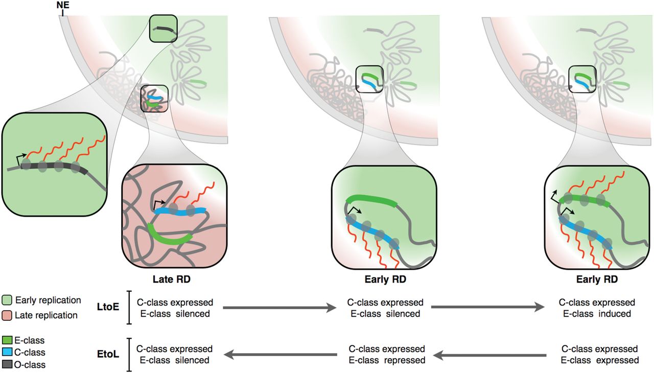 RT and transcriptional control. Early replication occurs in the nuclear interior, while late replicated regions are positioned at the periphery. Two RDs illustrate the differences in organization of early and late replicated regions. Transcriptional activity (red lines) and chromatin organization of E- versus C-class genes are represented in the expanded pictures during EtoL and LtoE RT changes (see text for details).
