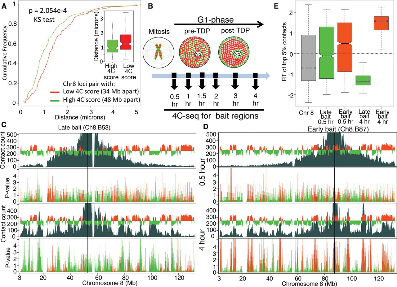 Establishment of interphase chromatin compartments during early G1. (A) Validation of 4C by 3D FISH. Cumulative frequency curves and box plots of distances (in microns) between FISH signals from a pair of regions with low 4C contact count (red, n = 51) or high 4C contact count (green, n = 57). (B) Schematic diagram of spatial distribution of early (red) and late (green) RDs within the nucleus before and after the establishment of a replication-timing program at the TDP in mouse C127 cells. Time points chosen for 4C after release from mitosis are indicated with black arrows. (No) Nucleolus. (C,D) “Contact count”: smoothed 4C data (dark gray) overlaid with the replication timing (RT) profile (red/green is early/late replicating) for a late replicating bait Ch8.B53 (C) and an early replicating bait Ch8.B87 (D). Both baits were analyzed at 0.5 h (top) and 4 h (bottom) after mitosis. “P-value”: negative log10 of contact P-values (Methods) colored in red or green for early or late replicating regions, respectively. Between 0.5 and 4 h after mitosis, contacts between bait and other intra-chromosomal regions become more significant and focused to those with similar RT as the bait. (E) Distribution of replication timing (RT) values for the strongest (top 5% highest z-scores) contacts with either the early replicating (Ch8.B87, red) or the late replicating (Ch8.B53, green) bait. Positive values of RT indicate early replication, negative values of RT indicate late replication, and zero indicates middle replication. The higher the magnitude the earlier or later the region replicates. For reference, the RT distribution of the whole Chr 8 is shown in gray. Contacts at 0.5 h did not have statistical significance, whereas 4 h had significant contacts to regions with the same RT as the bait (Supplemental Fig. 7A).