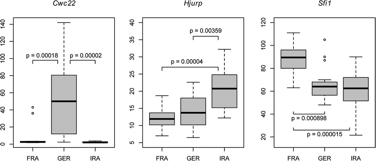 Extended population survey for extreme CNV loci. ddPCR was used to measure the copy number of Cwc22, Hjurp, and Sfi1 in animals belonging to the French (n = 16), German (n = 15), and Iranian (n = 16) populations. The distributions of their copy numbers per population is shown as a boxplot. To detect differences between the populations, ANOVA was performed, followed by Tukey's HSD. Only significant P values (P-adj < 0.05) are shown.