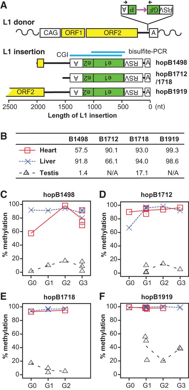 Integrating marker sequences into the mouse germline through L1 retrotransposition. (A) The donor L1 transgene ORFeus consists of a modified chicken beta-actin promoter (CAG), codon-optimized mouse L1 ORF1 and ORF2, a GFP-based retrotransposition indicator cassette in the 3′ UTR, and a polyadenylation signal (boxed letter A). The GFP cassette is placed in the antisense orientation relative to L1 transcription. The GFP reporter gene is flanked by Rous sarcoma virus (RSV) promoter and a polyadenylation signal but interrupted by a sense-oriented intron (purple horizontal arrow). Black arrows designate the location of genotyping primers. Retrotransposition creates a new L1 insertion, which is typically 5′ truncated, intronless, and trailed by a poly(A) DNA tract. Sequence structure of characterized L1 insertions is drawn to scale. All insertions are aligned at the 3′ end. For clarity, target site duplications and 3′ poly(A) tracts are omitted. Inverted letters indicate antisense orientation. For hopB1919, a near full-length insertion, only its 3′ portion is shown. Indicated above the insertions is the location of a 899-bp CGI predicted by newcpgseek as well as the region amplified by bisulfite PCR. (B) Methylation in GFP for all G0 animals. Animal IDs are indicated at the top. B1712 and B1718 are siblings with the same insertion. No testicular data are shown for B1919 and B1712 as both are female. (C–F) Contrasting methylation profiles between somatic tissues (heart and liver), and germ cells are maintained across multiple generations. Each point represents data from one individual animal. The connecting lines depict average methylation levels.
