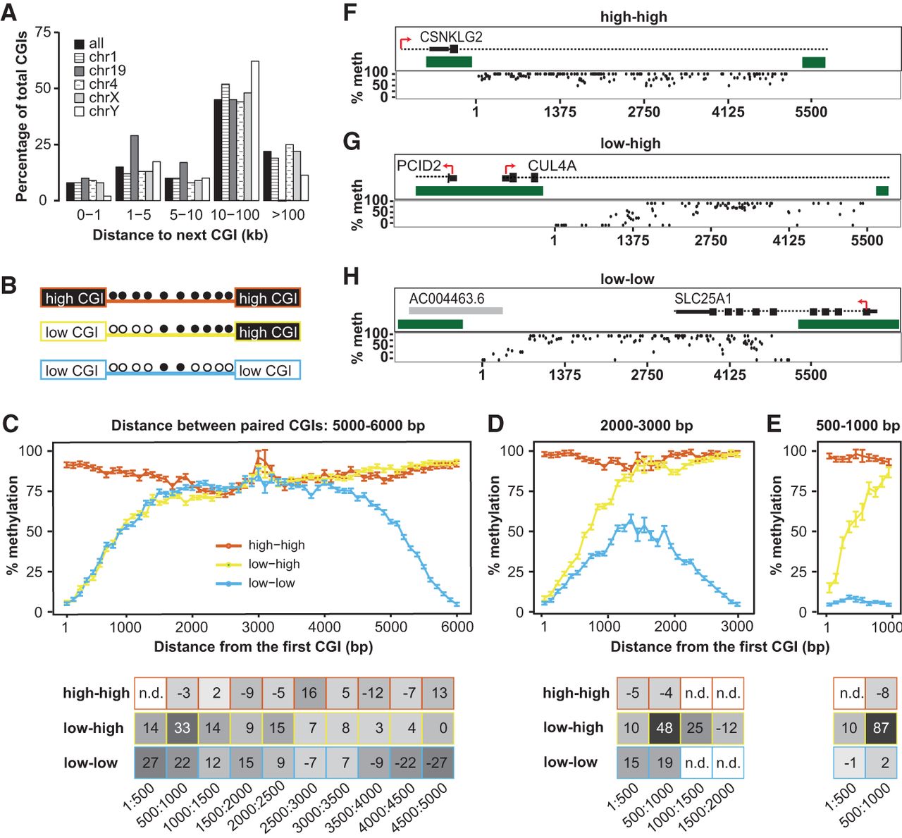 Neighboring CGIs influence shore slopes. (A) Percentage of CGIs that have a neighboring CGI within a given distance, either genome-wide or in selected chromosomes. (B) Schematic of possible pairs of CGIs: high-high, low-high, and low-low. Methylation status of CpGs between islands is indicated as filled (methylated) or open (unmethylated) circles. (C) Pairs of CGIs within 5000–6000 bp apart. Plot represents global average over 100-bp intervals. Error bars represent standard errors of the mean. The x-axis indicates distance of the CpG from the first CGI (on the left). Slope of the shore at various intervals is represented on the table below the plot. Points with n.d. did not have enough CpGs in the given interval to calculate a slope. Plots do not include CGI CpGs. (D) Pairs of CGIs within 2000–3000 bp apart. (E) Pairs of CGIs within 500–1000 bp apart. (F–H) Representative examples of CGI pairs in the genome for high-high (F), low-high (G), and low-low (H). Genomic context is pictured above each plot. Dark green blocks represent the CGIs. Red arrows indicate the direction of transcription. Black boxes and dashed lines denote annotated genes. Gray boxes denote annotated transcripts. Each dot represents one CpG. Plots do not include CpGs inside a CGI. The x-axis indicates distance from the CGI on the left.
