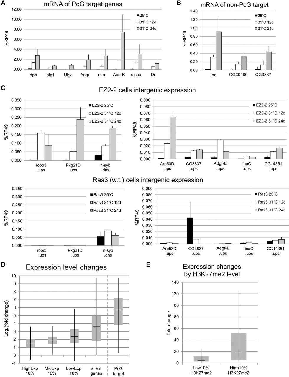 Global transcriptional increase after E(z) inactivation. (A,B) Expression levels of PcG target genes and silent non-PcG target genes in EZ2-2 cells at 25°C and 31°C were assayed by RT-qPCR and shown relative to RpL32. Since the expression of RpL32 increases approximately twofold at 31°C (Supplemental Fig. 5A), this normalization is conservative. (C) Expression levels of a panel of silent intergenic non-PcG target regions in EZ2-2 cells at 25°C and 31°C. The Ras3 panel shows expression levels in a control wild-type cell line (Ras3) at the same temperatures. (D) Global derepression in coding regions after E(z) inactivation. The log ratio of the expression levels at 31°C and 25°C was calculated for non-PcG targets with different expression levels and for PcG targets. For silent genes, one expression tag read was added to the number of RNA-seq tags to estimate the approximate fold-differences. The bottom and top of each box represent the first and third quartiles, and the mark inside the box is the median value. Whiskers are extended to 1.5× interquartile range. (E) Preferential transcriptional increase at H3K27me2-enriched genes. Expression fold-change between 31°C and 25°C was calculated for the non-PcG target genes with the lowest and the highest levels of H3K27me2.