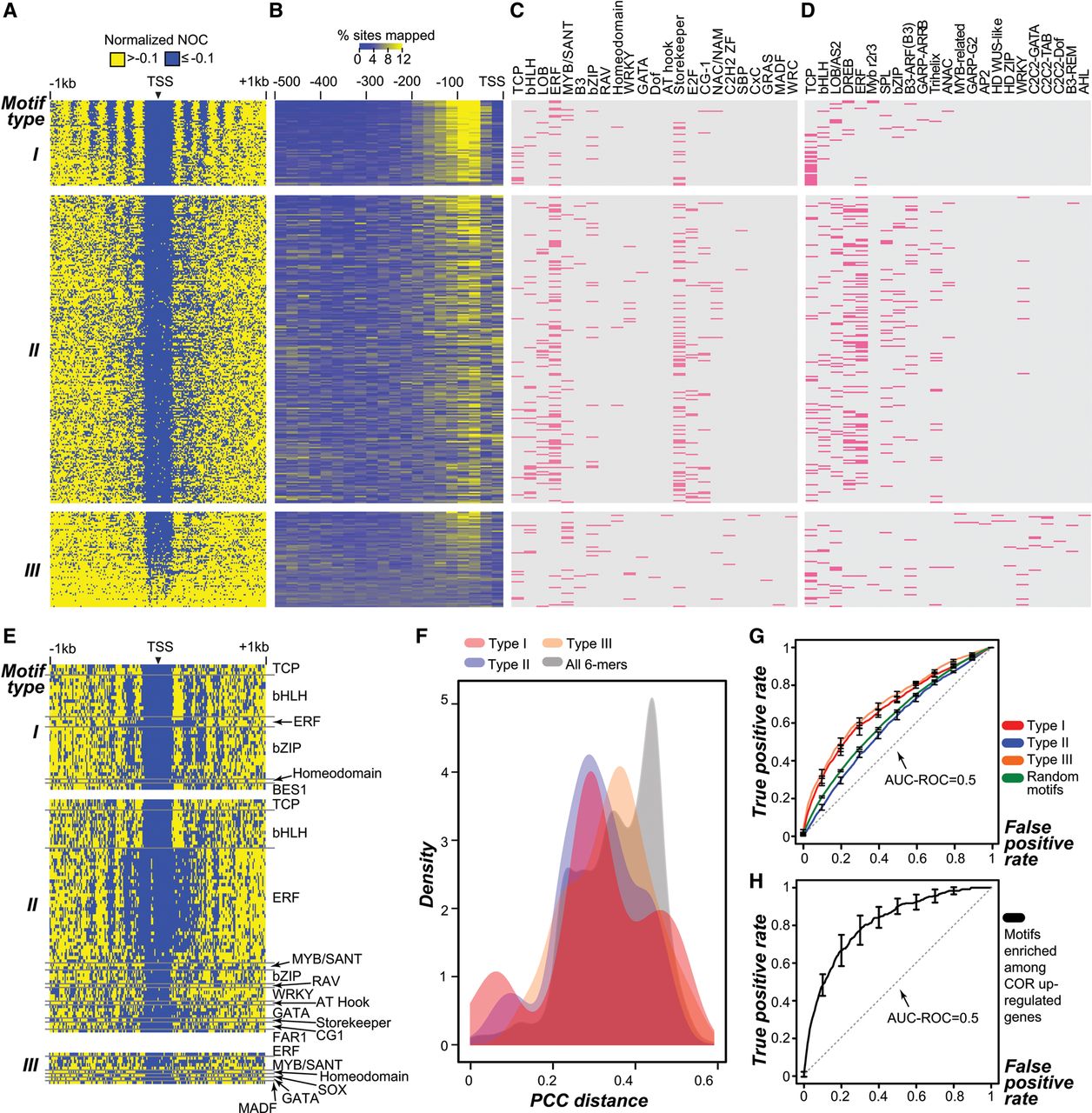 Properties of Type I, II, III motifs. (A) Nucleosome phasing pattern in 1-kb regions flanking 6-mer motif sites. Type I, II, and III motifs are as defined in Figure 3A. (Arrowhead) 6-mer motif position; (blue) lower occupancy; (yellow) higher occupancy. (B) Positional bias of motif sequences located within proximal promoter regions. Color represents the proportion (%) of 6-mer sites in a 25-bp bin compared to the entire region. (C) Families with TFs that likely bind to Type I, II, and III motifs. (Pink) 6-mer with significantly higher in vitro binding affinity (P ≤ 0.01) to a TF in a family (Weirauch et al. 2014) compared to random 6-mers (Methods). (D) TF families that likely bind to Type I, II, and III 6-mer motifs. (Pink) the best matching binding motif from a TF family (Franco-Zorrilla et al. 2014) to a 6-mer with PCC distance ≤0.38 (P < 0.05) (Methods). (E) Nucleosome phasing pattern in 1-kb regions flanking TFBM sites (Weirauch et al. 2014). (F) PCC distance distributions of Type I, II, and III motifs and all 6-mers compared to their top matching TFBMs (Franco-Zorrilla et al. 2014). (G) Performance of gene expression predictive models based on Type I, II, and III as well as randomly chosen 6-mer motifs. (Random guess) gray dotted line. (H) Performance of gene expression predictive models based on motifs enriched among COR-induced genes (black line). (Random guess) gray dotted line; (error bar) the standard error at 0.1 false positive rate intervals; (AUC-ROC) Area Under Curve-Receiver Operating Characteristic.