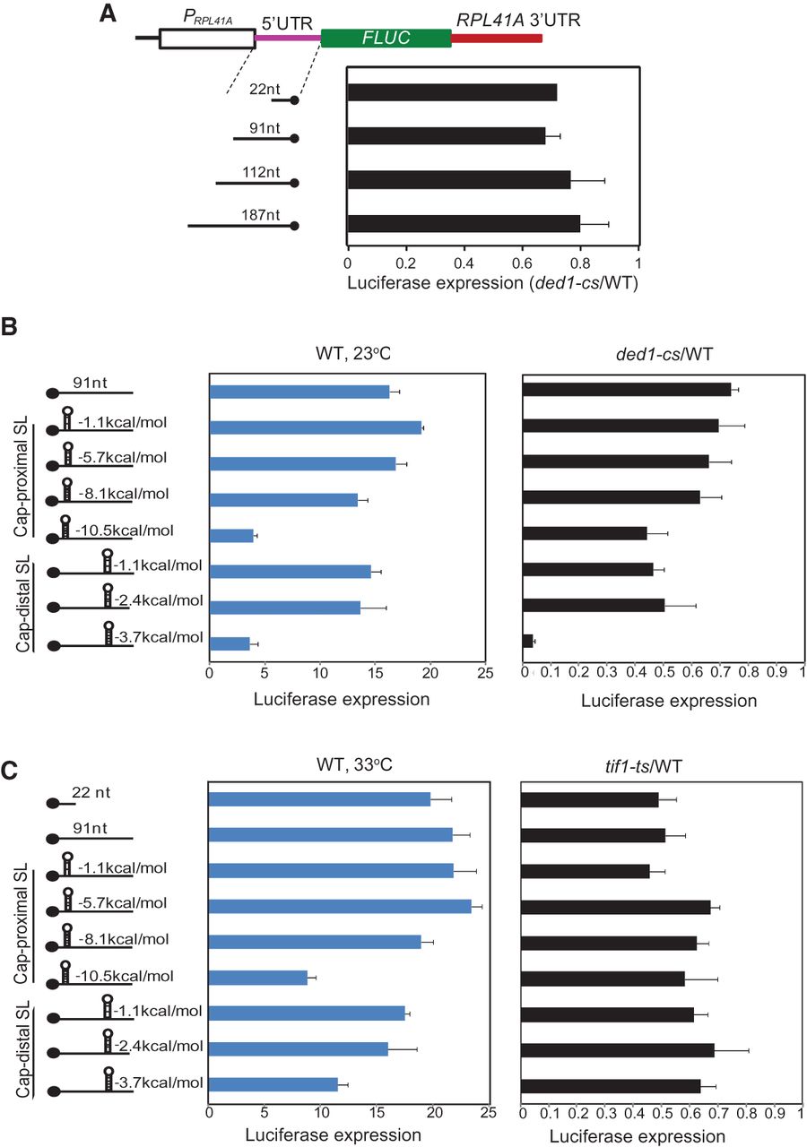 Cap-distal, but not cap-proximal, SL insertion confers strong Ded1 dependence on LUC reporter expression. (A) Schematics of LUC reporters containing promoter, 22-nt 5′ UTR, and first four codons of RPL41A fused to FLUC coding sequences and modified RPL41A 3′ UTR, plus indicated 5′ UTR insertions of CAA repeats. LUC expression was assayed as in Figure 4B and mean (±SEM) ratios of expression in ded1-cs versus WT cells are plotted. (B) Schematics to indicate the position and stability of SLs (predicted at http://rna.urmc.rochester.edu/RNAstructure.html) inserted into the 91-nt 5′ UTR reporter in A. LUC expression was assayed as in Figure 4B; and mean (±SEM) expression (in million units) in WT (middle) and ratios of expression in ded1-cs versus WT cells (right) are plotted. (C) Same as B except that LUC expression was measured in three transformants of WT and tif1-ts by preculturing in SC−Leu−Ura at 23°C, diluting to OD600∼0.1, and growing for ∼three doublings at 33°C (∼24 h for tif1-ts and ∼6 h for WT).