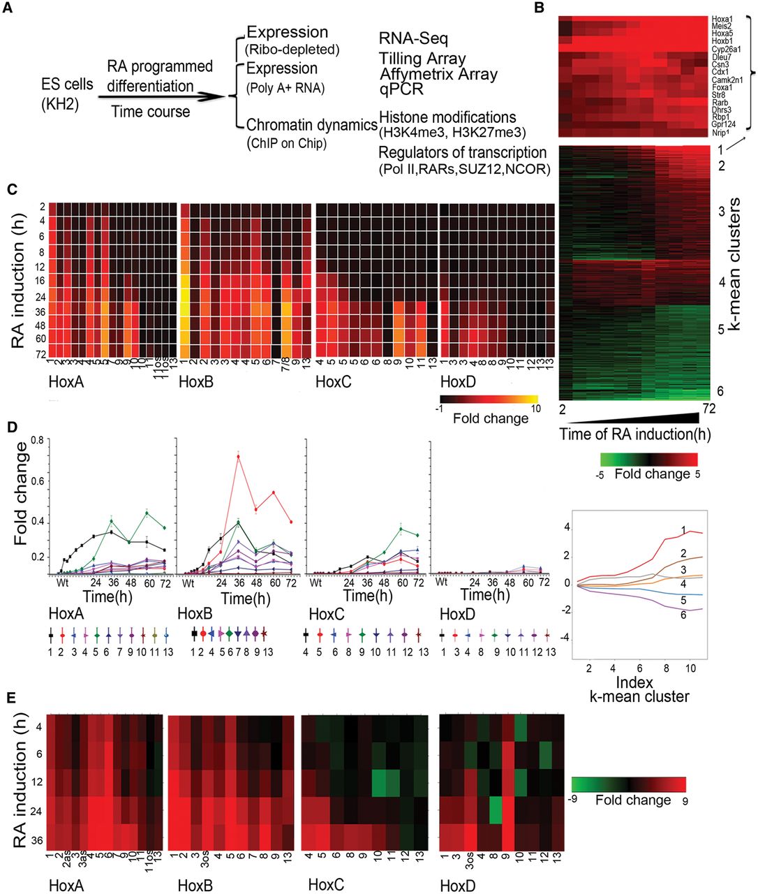 Analysis of changes in Hox and global gene expression during RA-induced differentiation of mouse ES cells. (A) Flow chart outlining overall experimental strategy. (B) Heatmap showing global changes in gene expression upon RA induction compared with uninduced ES cells as analyzed on Affymetrix Mouse Genome 430 2.0 arrays. The lower panel shows the distinct induction profiles of six clusters, identified by k-means clustering. Expression values are the average value from three independent biological replicates. The middle panel displays a heatmap of global changes in gene expression upon RA-induced differentiation; k-means clusters are indicated on the right. Only clusters with an absolute value of cluster mean >0.5 are shown. The upper panel shows changes in the expression profile for 15 of the most rapidly induced genes in cluster 1, which includes Hox genes and genes for the cofactors (Meis). (C) Heatmap of relative changes in Hox gene expression upon RA induction compared with uninduced ES cells as analyzed on Affymetrix Mouse Genome 430 2.0 arrays. Genes in the HoxA and HoxB clusters display a more rapid and robust induction than those of the HoxC and HoxD clusters. Several genes have multiple probes, and results are shown for each. (D) Temporal changes in Hox gene expression induced by RA quantitated by TLDA qPCR microfluidics cards. All data points are the average of three biological and two technical replicates. The y-axis in all clusters is shown on the same scale and illustrates relative levels of induction between Hox clusters. (E) RNA-seq analysis of Hox gene expression in RA treated ES cells compared to uninduced cells. Fold changes are shown as a heatmap.