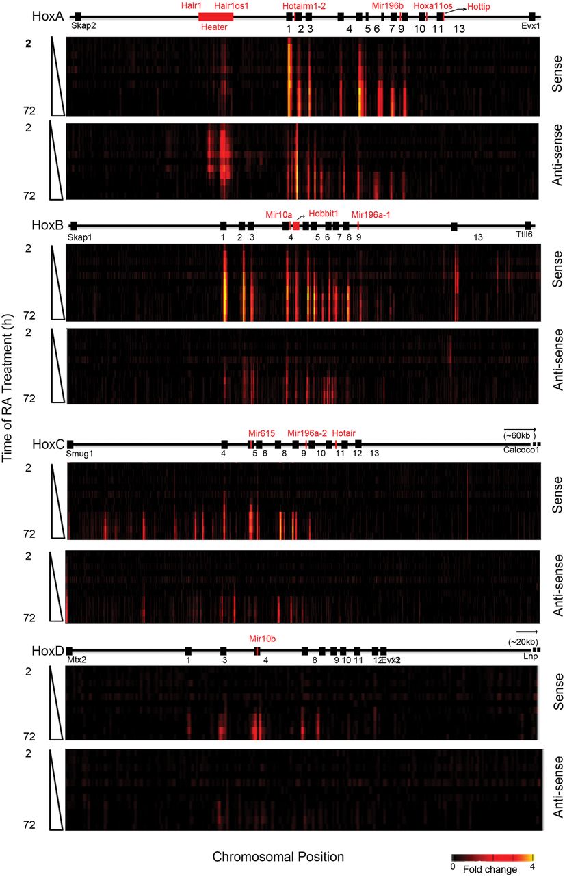 Global transcriptional activity in and around the four Hox clusters analyzed by Agilent tiling arrays. Heatmap showing global changes in gene expression over the time course of RA induction compared with uninduced ES cells as analyzed on custom Agilent 2x105K Hox tiling arrays. mRNA is labeled with Cy3. Heatmaps are generated on the Integrative Genomics Viewer (IGV) 1.5, where intensity of heat represents relative expression level. Upper and lower panels in each cluster represent sense and antisense strands, respectively. The x-axis denotes the chromosomal position and location of respective Hox genes and ncRNAs. The y-axis denotes the length of RA treatment in h.