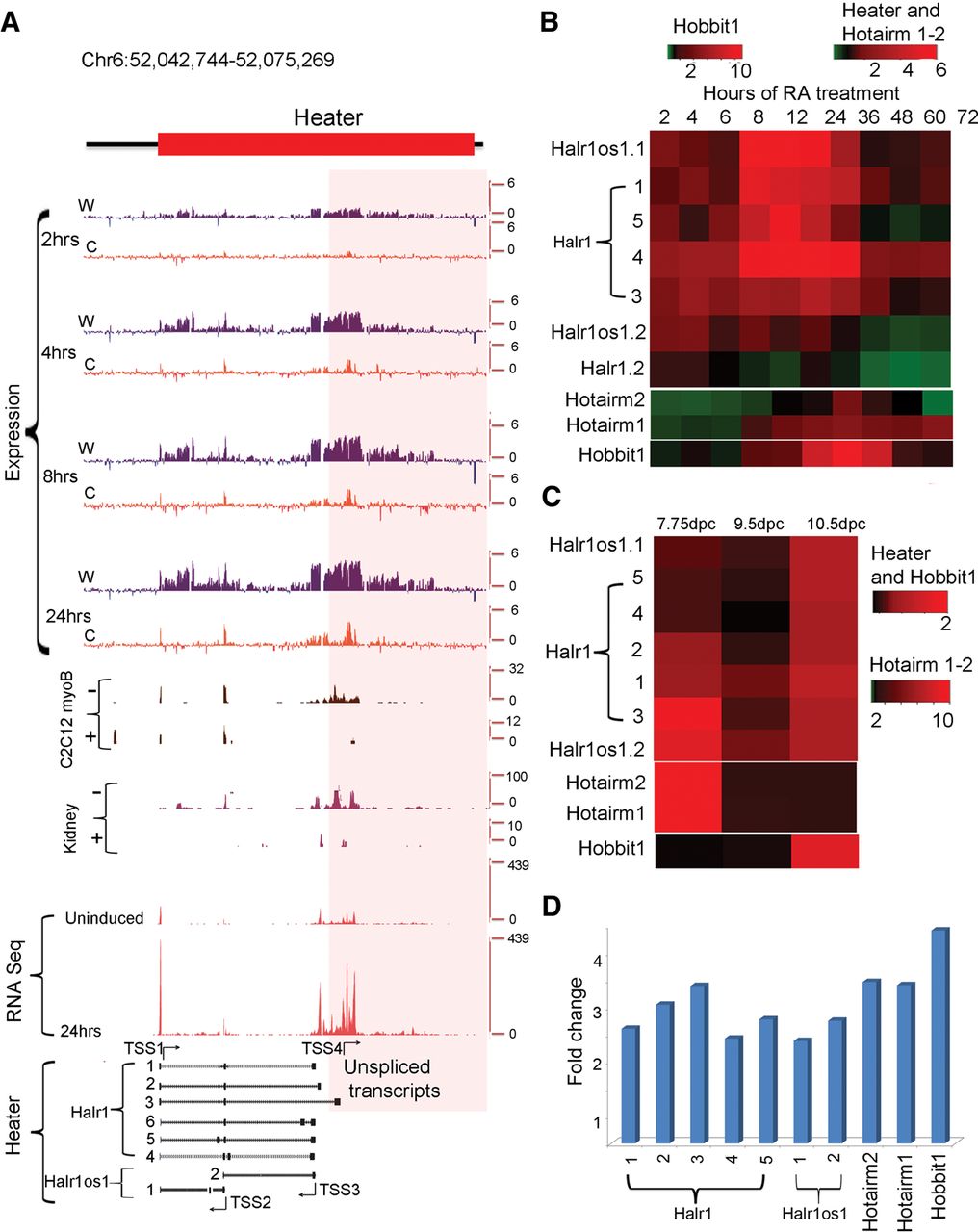 Characterization of Heater (HoxA EArly Transcribed REgion) transcripts. (A) Transcription from the Heater region analyzed by tilling arrays, RNA-seq, and ENCODE. The top of the panel shows rapid induction of Heater transcripts between 2 and 24 h of RA treatment detected by tiling array profiles. W and C represent Watson and Crick strands, respectively. In the middle of the panel is evidence of Heater expression in adult kidney and cultured cells based on ENCODE data. + and − indicate opposing strands. RNA-seq data in uninduced and 24-h RA-treated ES cells validate expression profiles observed in tiling arrays. At the bottom, multiple Heater transcripts, from Halr1 and Halr1os1, are shown schematically with the respective transcription start sites (TSS) and direction of transcription as indicated by arrows. The pink box denotes a region with a large number of unspliced transcripts generated from TSS4. (B) Heatmap of qPCR quantitation of Halr1, Halr1os1, Hotairm1, Hotairm2, and Hobbit1 transcripts in RA-induced ES cells. Levels of transcripts are compared against respective transcript levels in uninduced ES cells. Heater, Hotairm1, and Hotairm2 are induced at comparable levels, whereas Hobbit1 shows a higher level of induction in RA-induced differentiation. (C) Heatmap of qPCR quantitation of Halr1, Halr1os1, Hotairm1, Hotairm2, and Hobbit1 transcripts in developing mouse embryos. Levels of transcripts are compared against respective transcript levels in 10 dpc embryo. Heater and Hobbit1 are induced at comparable levels, whereas Hotairm1 and Hotairm2 show higher levels of induction during mouse embryonic development. Green represents down-regulation; red shows up-regulation. (D) Response of Halr1, Halr1os1, Hotairm1, Hotairm2, and Hobbit1 to RA in mouse embryos. The relative response to RA is calculated as fold change in transcript level after treating 10.0 dpc mouse embryos with RA compared to untreated mouse embryos at the same stage.