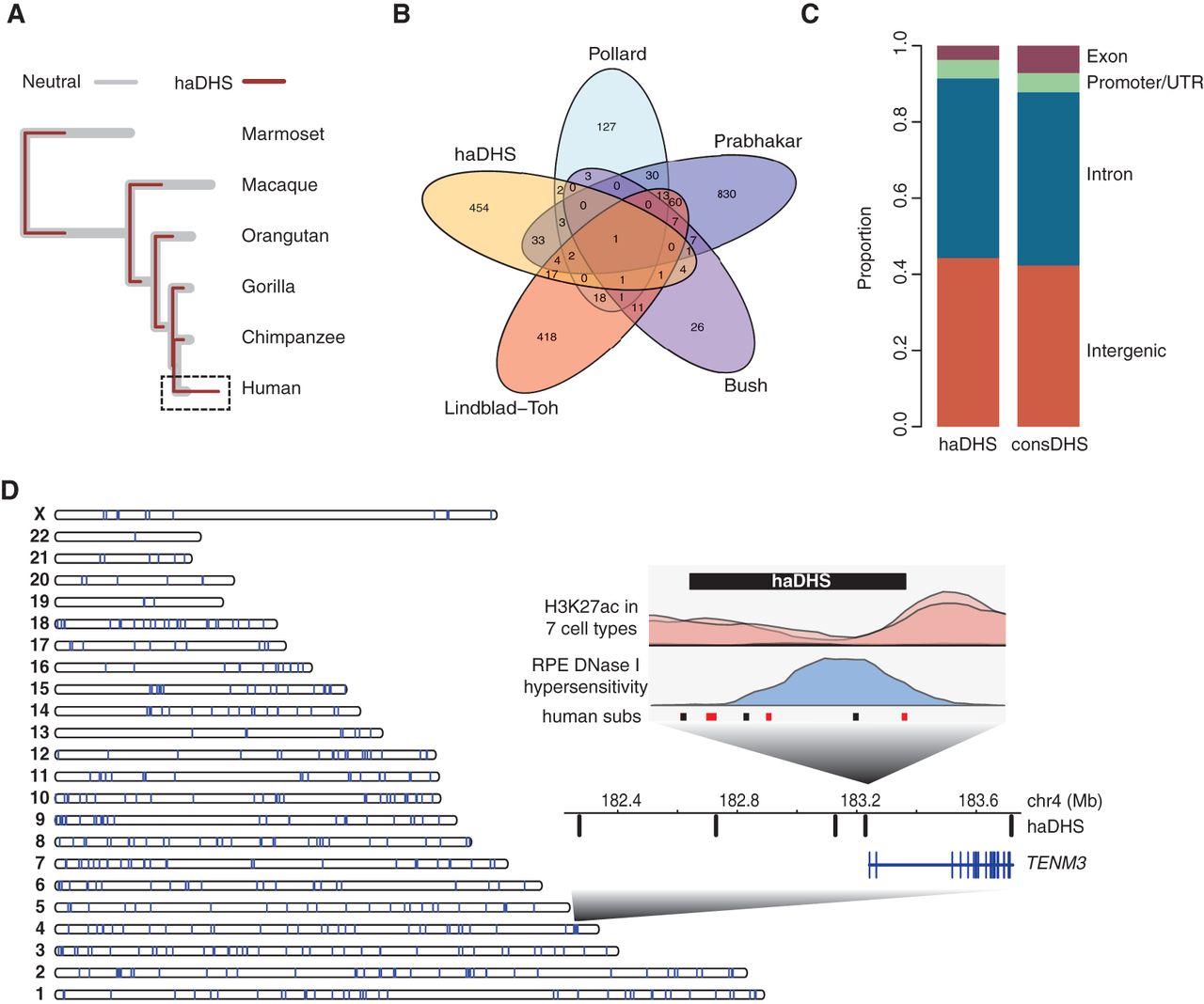 Characteristics of human-accelerated DHSs. (A) Overlaid phylogenetic trees inferred in haDHSs (maroon) versus their flanking neutral regions (gray). The human branch is highlighted by the dashed rectangle. (B) Venn diagram showing overlap of haDHSs with human accelerated elements (HAEs) identified in previous studies. (C) The proportion of bases in haDHSs and conserved DHSs that are located in different functional classes of genomic sequence. (D) Distribution of haDHSs across the genome. Each vertical bar on the chromosome ideogram represents an haDHS. (Inset) Plot shows a region on Chromosome 4 near the TENM3 gene that contains five haDHSs. The fourth haDHS is enlarged to show that it is accessible in retinal pigment epithelial cells (blue) and is flanked by an H3K27ac signal (pink). Human substitutions are shown in red (weak to strong) and black (all others).